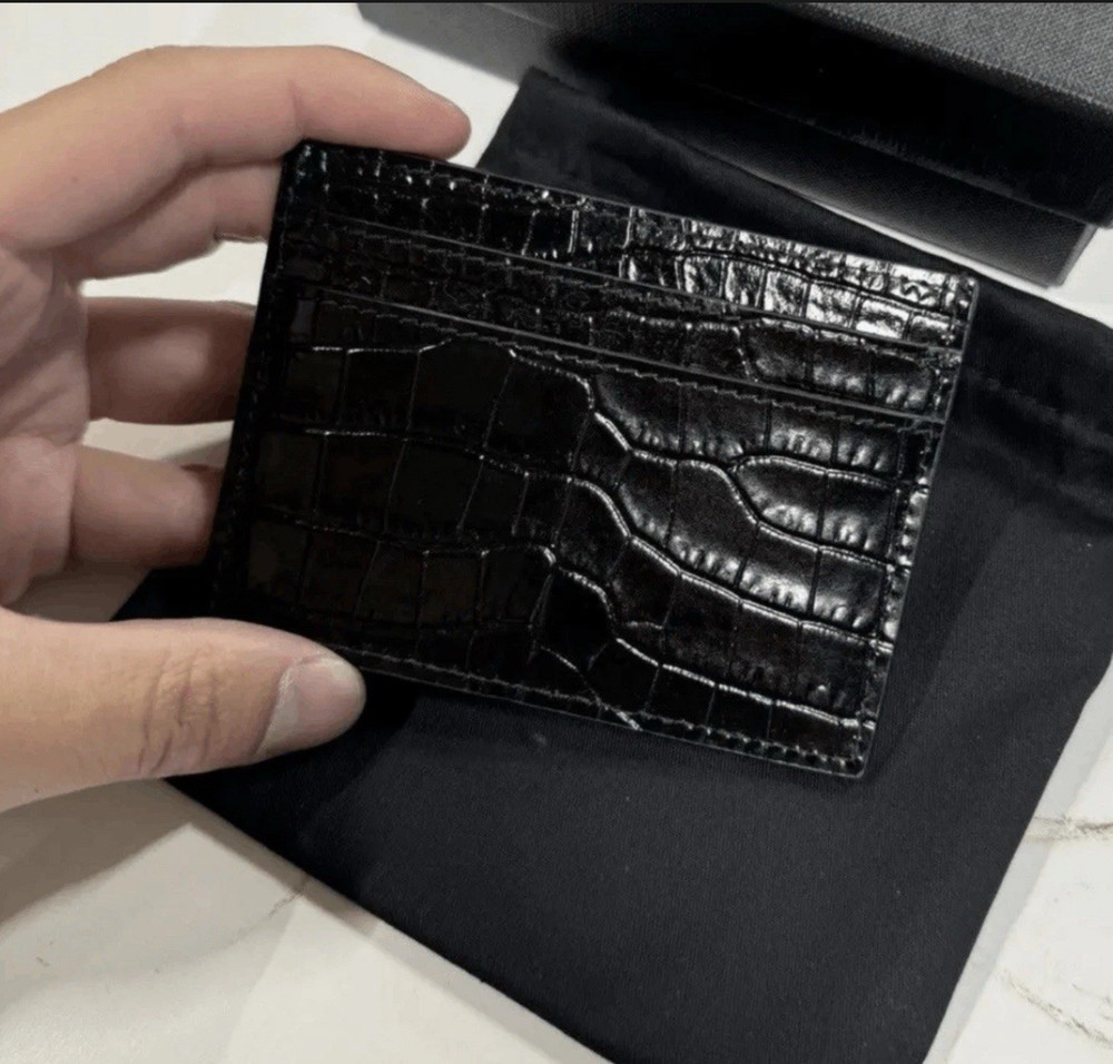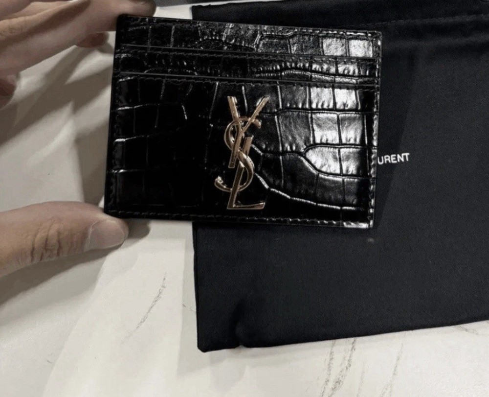 SAINT LAURENT CASSANDRE CROC-EMBOSSED CARDHOLDER Color: Black Hardware: Gold-Tone Cassandre Logo Condition: Brand New With Tags MSRP: $450+ ⸻ ITEM OVERVIEW Brand: Saint Laurent Model: Cassandre Cardholder Material: Croc-Embossed Leather Color: Black Hardware: Gold-Tone YSL Cassandre Logo Condition: Brand New With Original Tags Attached This model is increasingly difficult to source in brand new condition. ⸻ DESCRIPTION The Saint Laurent Cassandre Cardholder is a refined expression of minimalist luxury. Crafted in croc-embossed leather, this piece showcases Saint Laurent’s iconic gold-tone Cassandre monogram, offering a bold yet sophisticated aesthetic. The structured silhouette and glossy embossed finish create a striking contrast against the polished metal hardware. Designed for streamlined everyday carry, the cardholder features multiple card slots while maintaining a slim, elegant profile suitable for both casual and formal settings. Compact, functional, and unmistakably Saint Laurent, this piece represents timeless Parisian design and elevated craftsmanship. Highly sought-after in croc-embossed leather, this version is increasingly hard to find in brand new condition. ⸻ FEATURES & DETAILS • Croc-embossed leather construction • Iconic gold-tone YSL Cassandre monogram • Slim, structured profile • Multiple card slots for essential storage • Made in Italy • Luxury polished finish • Ideal for minimal everyday carry Approximate Retail: $450+ ⸻ CONDITION Brand New With Original Tags (BNWT). Unworn and in pristine condition. Please review all photos carefully for full details. ⸻ AUTHENTICITY GUARANTEE Authenticity is fully guaranteed. This item has been professionally authenticated in-house by The Designer Vault & Co prior to listing and is verified to be 100% authentic. Each item undergoes a structured authentication review process, including: • Material and leather inspection • Logo placement and hardware verification • Stitching precision analysis • Model conformity confirmation Purchase with complete confidence. ⸻ BRAND AFFILIATION DISCLOSURE The Designer Vault & Co is an independent luxury reseller and is not affiliated with, authorized by, or officially connected to Saint Laurent or any other brand referenced. All trademarks, brand names, and logos are used strictly for identification and descriptive purposes. ⸻ THE DESIGNER VAULT & CO STANDARD The Designer Vault & Co specializes in sourcing and curating authentic luxury pieces with an emphasis on integrity, discretion, and professional presentation. We are committed to precise descriptions, accurate representation, and elevated client service. For any additional information, please feel free to message prior to purchase.