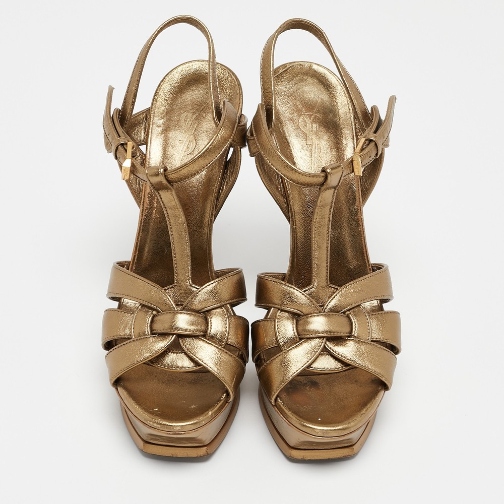 These sandals will frame your feet in an elegant manner. Crafted from quality materials, they flaunt a classy display, comfortable insoles and durable heels.Certified by The Luxury Closet - This item has gone through a detailed authentication process overseen by our experts. We offer a lifetime guarantee of authenticity on all our items. Import duties, taxes and charges are not included in the item price. These charges are the buyers responsibility. Please check with your country’s customs office to determine what these additional cost will be prior to buying. Our eBay Store About Us Contact Us Add to Favorite Sellers Saint Laurent Gold Leather Tribute Platform Sandals Size 39 $249.7 These sandals will frame your feet in an elegant manner. Crafted from quality materials, they flaunt a classy display, comfortable insoles and durable heels. Product Details Brand Color Gold Dimensions Material Leather Size 39 Outsole Width 7 cm Outsole Length 22.5 cm Heel Height 14 cm Includes The Luxury Closet Packaging Certified by The Luxury Closet This item has gone through a detailed authentication process overseen by our experts. We offer a lifetime guarantee of authenticity on all our items. How We Check The in-house team of experts at The Luxury Closet is highly trained to verify the authenticity and the condition of the luxury products. They ensure that only 100% authentic items are put on sale.The evaluation process is unique with its own mix of assessment criteria and differs according to the category. Each item is evaluated based on the following combination of hallmarks, hardware, stitching, symmetry, material, craftsmanship, stamping, codes, hologram stickers, and packaging. Our authenticators also check if the items have been modified or amended (e.g., aftermarket diamonds, replaced batteries, repaired bags, etc.) International Buyers Import duties, taxes and charges are not included in the item price. These charges are the buyers responsibility. Please check with your country’s customs office to determine what these additional cost will be prior to buying.