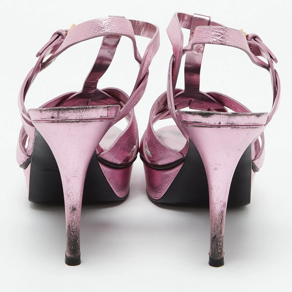 The fashionista in you will instantly fall in love with these Saint Laurent Tribute sandals They are made from metallic pink leather with intertwined straps on the vamps and ankle buckle closure. The gold tone hardware, 11cm heels, and platforms give it a fine finishing.Certified by The Luxury Closet - This item has gone through a detailed authentication process overseen by our experts. We offer a lifetime guarantee of authenticity on all our items. Import duties, taxes and charges are not included in the item price. These charges are the buyers responsibility. Please check with your country’s customs office to determine what these additional cost will be prior to buying. Our eBay Store About Us Contact Us Add to Favorite Sellers Saint Laurent Metallic Pink Leather Tribute Platform Sandals Size 40 $203.5 The fashionista in you will instantly fall in love with these Saint Laurent Tribute sandals They are made from metallic pink leather with intertwined straps on the vamps and ankle buckle closure. The gold tone hardware, 11cm heels, and platforms give it a fine finishing. Product Details Brand Color Pink Dimensions Material Leather Size 40 Outsole Width 7 cm Outsole Length 26 cm Heel Height 11 cm Includes Original Dustbag, Extra Heel Tips Certified by The Luxury Closet This item has gone through a detailed authentication process overseen by our experts. We offer a lifetime guarantee of authenticity on all our items. How We Check The in-house team of experts at The Luxury Closet is highly trained to verify the authenticity and the condition of the luxury products. They ensure that only 100% authentic items are put on sale.The evaluation process is unique with its own mix of assessment criteria and differs according to the category. Each item is evaluated based on the following combination of hallmarks, hardware, stitching, symmetry, material, craftsmanship, stamping, codes, hologram stickers, and packaging. Our authenticators also check if the items have been modified or amended (e.g., aftermarket diamonds, replaced batteries, repaired bags, etc.) International Buyers Import duties, taxes and charges are not included in the item price. These charges are the buyers responsibility. Please check with your country’s customs office to determine what these additional cost will be prior to buying.