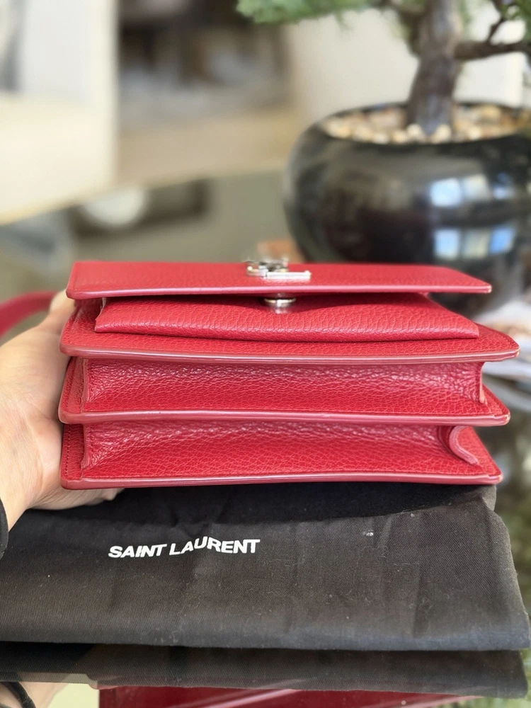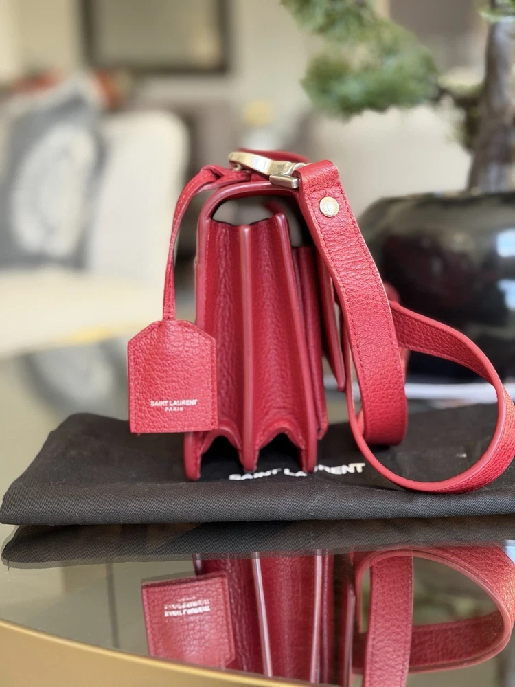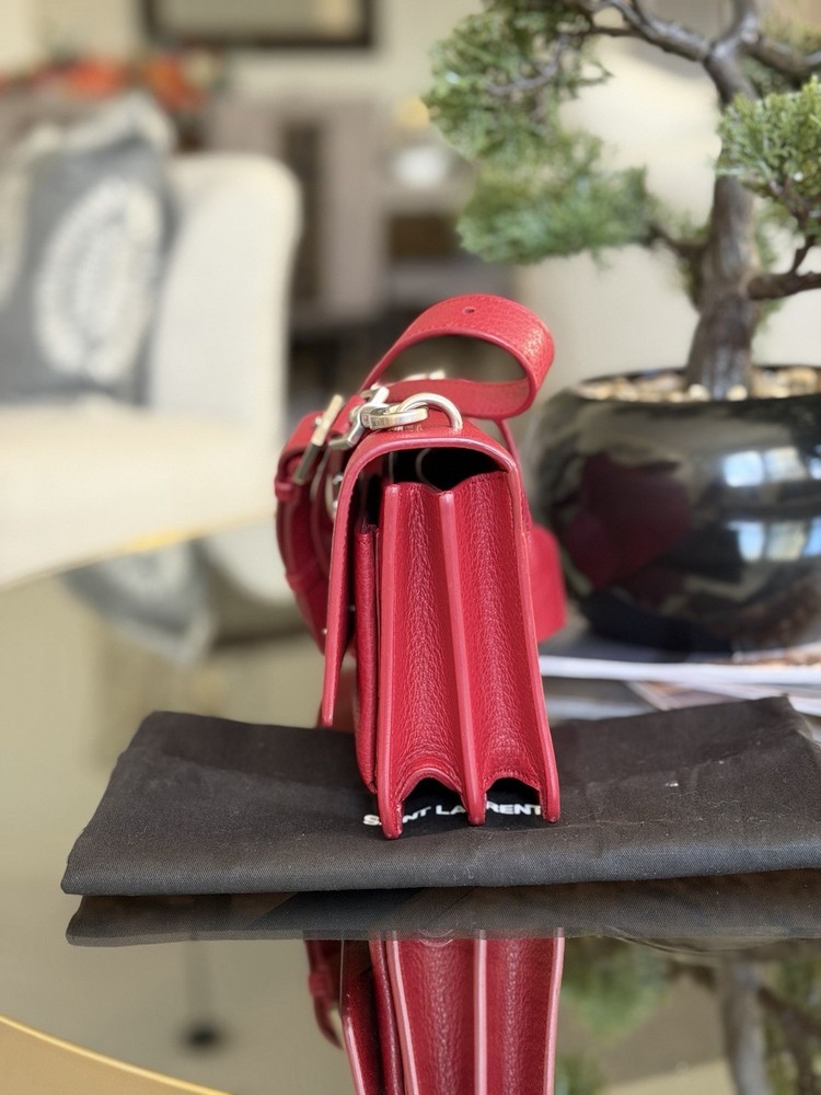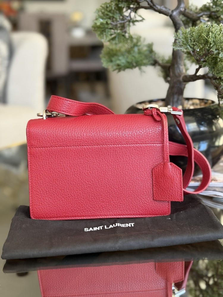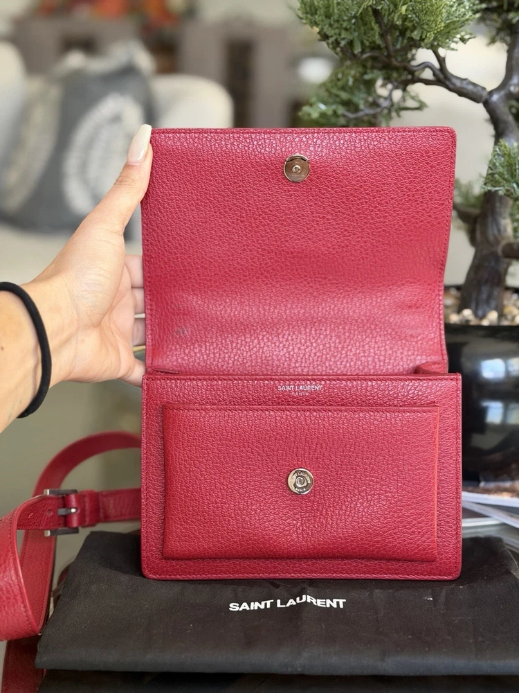 The Saint Laurent Flap Crossbody Bag in red calfskin leather is a stylish and compact accessory perfect for women on the go. With a solid rectangular shape and a magnetic closure, this small-sized bag is both practical and fashionable. The gold hardware adds a touch of elegance, while the black leather lining provides a classic finishing touch. The adjustable strap drop of 10-19 inches allows for versatility in carrying this chic piece from the Saint Laurent Classic Monogram collection. Ideal for adding a pop of color to any outfit, this crossbody bag is a must-have for fashion-forward individuals. This bag is beautiful and like new condition, red with silver hardware and I’m adding a dust bag for you ♥️
