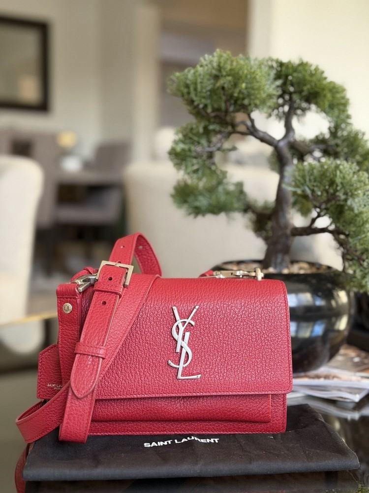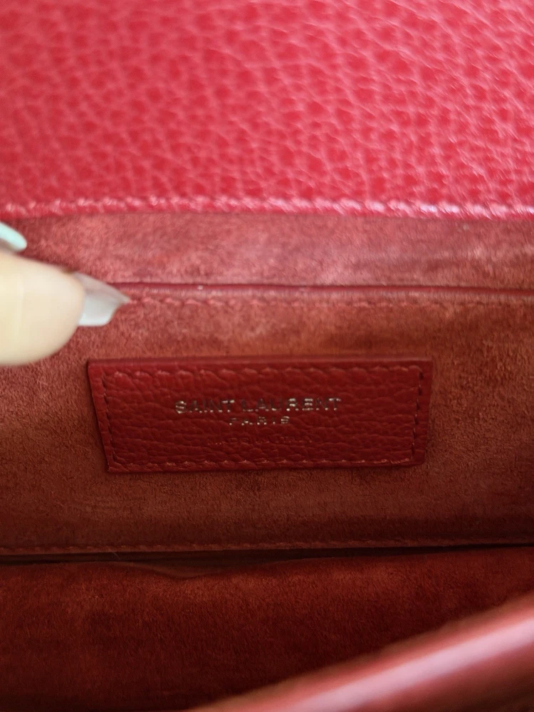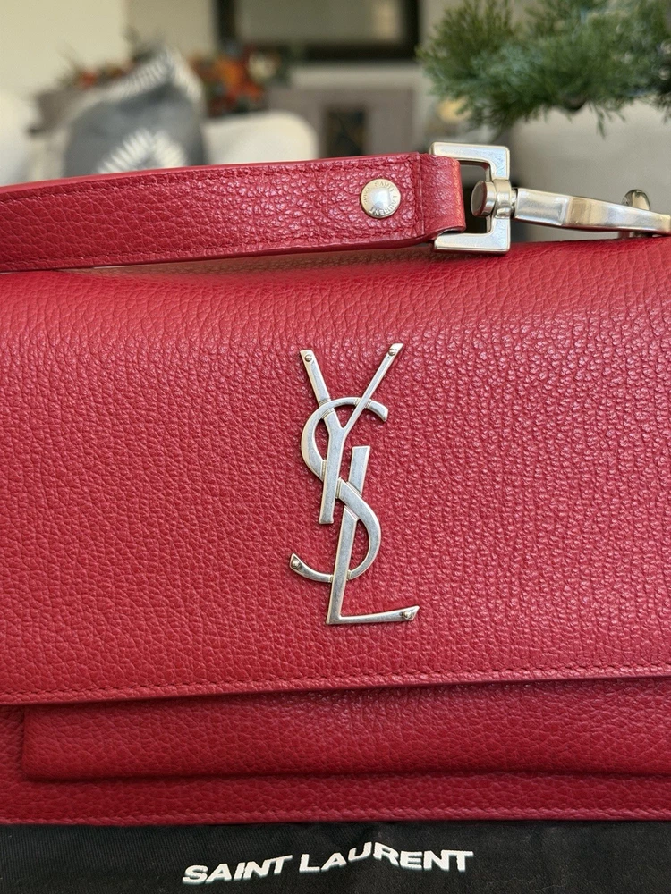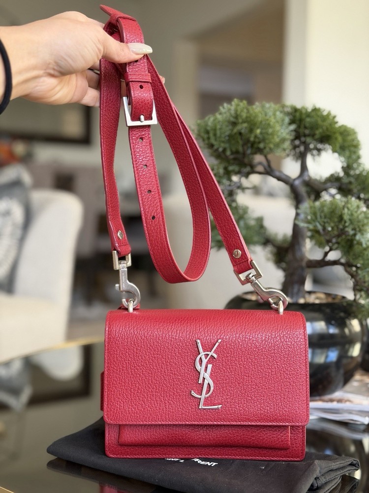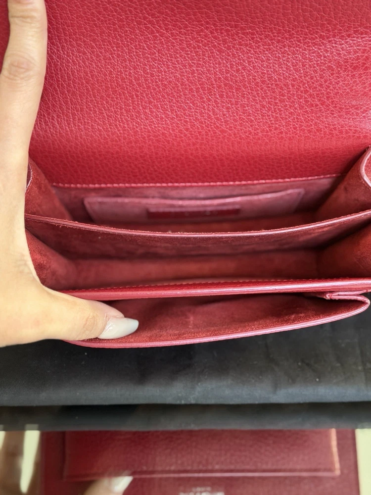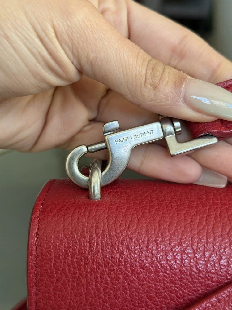 The Saint Laurent Flap Crossbody Bag in red calfskin leather is a stylish and compact accessory perfect for women on the go. With a solid rectangular shape and a magnetic closure, this small-sized bag is both practical and fashionable. The gold hardware adds a touch of elegance, while the black leather lining provides a classic finishing touch. The adjustable strap drop of 10-19 inches allows for versatility in carrying this chic piece from the Saint Laurent Classic Monogram collection. Ideal for adding a pop of color to any outfit, this crossbody bag is a must-have for fashion-forward individuals. This bag is beautiful and like new condition, red with silver hardware and I’m adding a dust bag for you ♥️