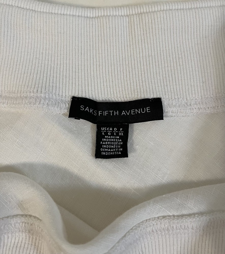 The product is a Saks Fifth Avenue off white linen A-line skirt in size large. This midi-length skirt is designed for women and features a lined interior, making it both stylish and comfortable. The ivory color adds a touch of sophistication to any outfit, while the A-line silhouette is flattering and versatile. Made from high-quality linen, this skirt is perfect for summer days or special occasions that call for a chic and timeless ensemble. Elastic Waist 32" Length 25"