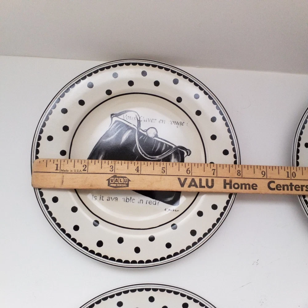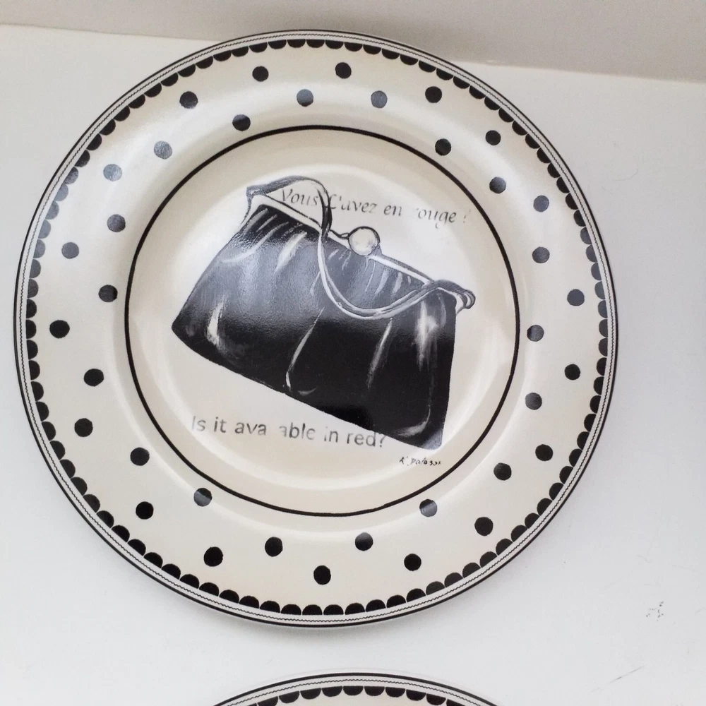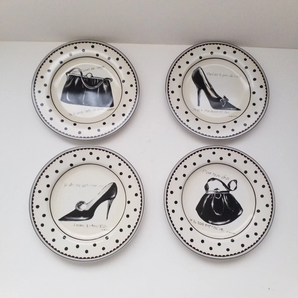 Preowned excellent condition Mademoiselle Sakura Kimberly Poloson Shoes and Purses black polka dots and white salad bread plates. 8 1/4" diameter. Set of four. No original box. Will be wrapped with care for shipping. Tags: kitchen decor tableware high heels handbags ceramic collection collector home brunch gift party bridal shower heels pocketbook