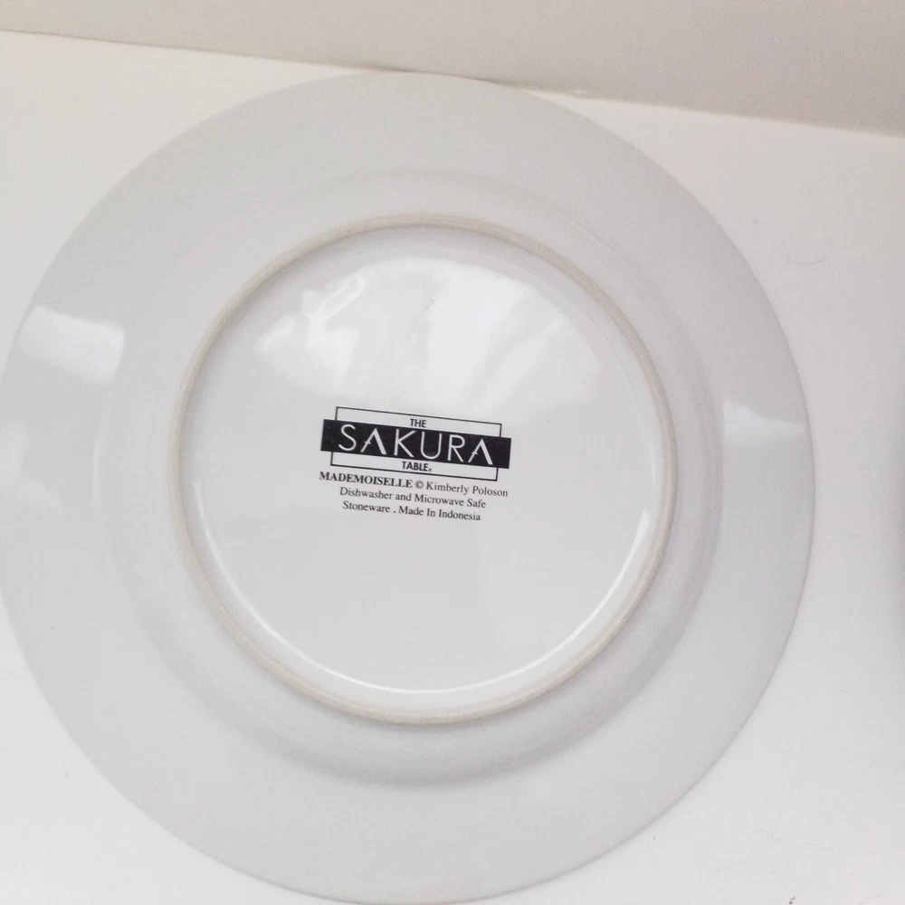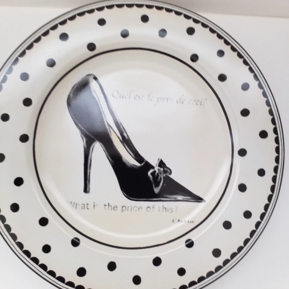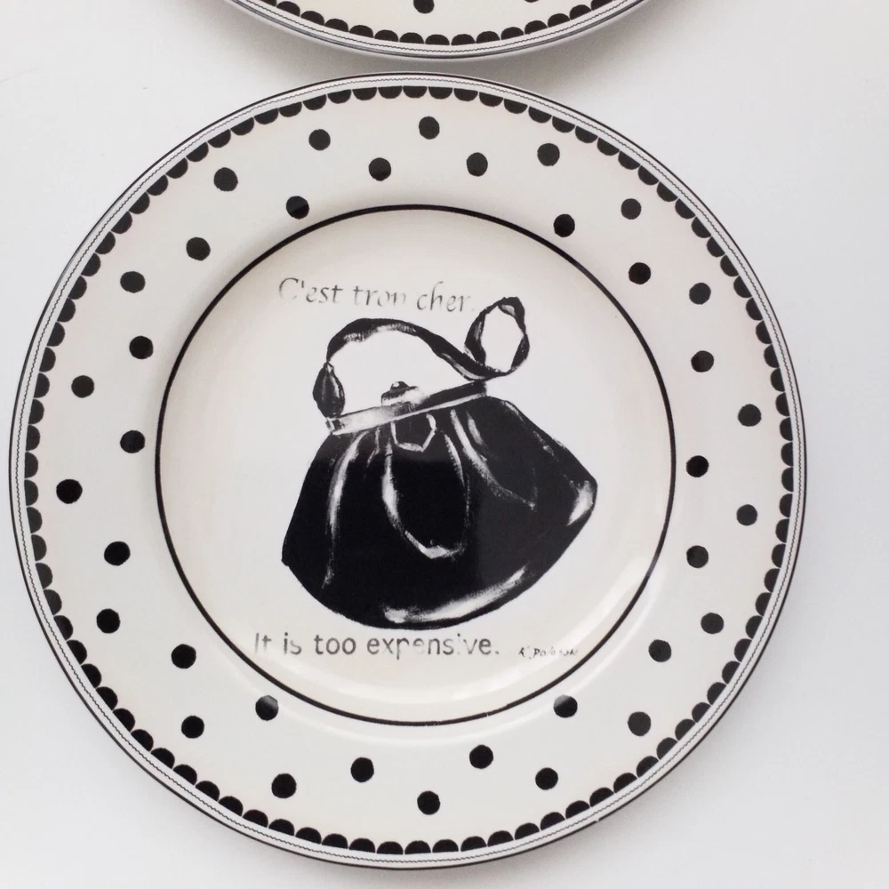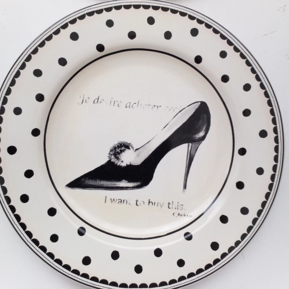 Preowned excellent condition Mademoiselle Sakura Kimberly Poloson Shoes and Purses black polka dots and white salad bread plates. 8 1/4" diameter. Set of four. No original box. Will be wrapped with care for shipping. Tags: kitchen decor tableware high heels handbags ceramic collection collector home brunch gift party bridal shower heels pocketbook
