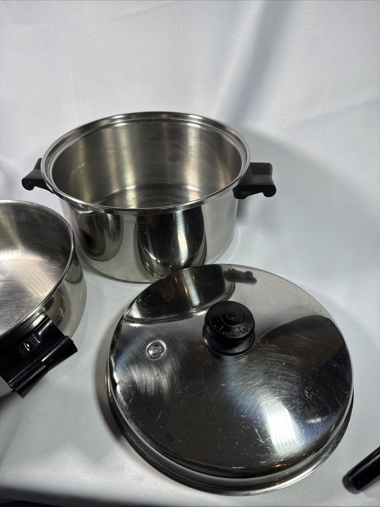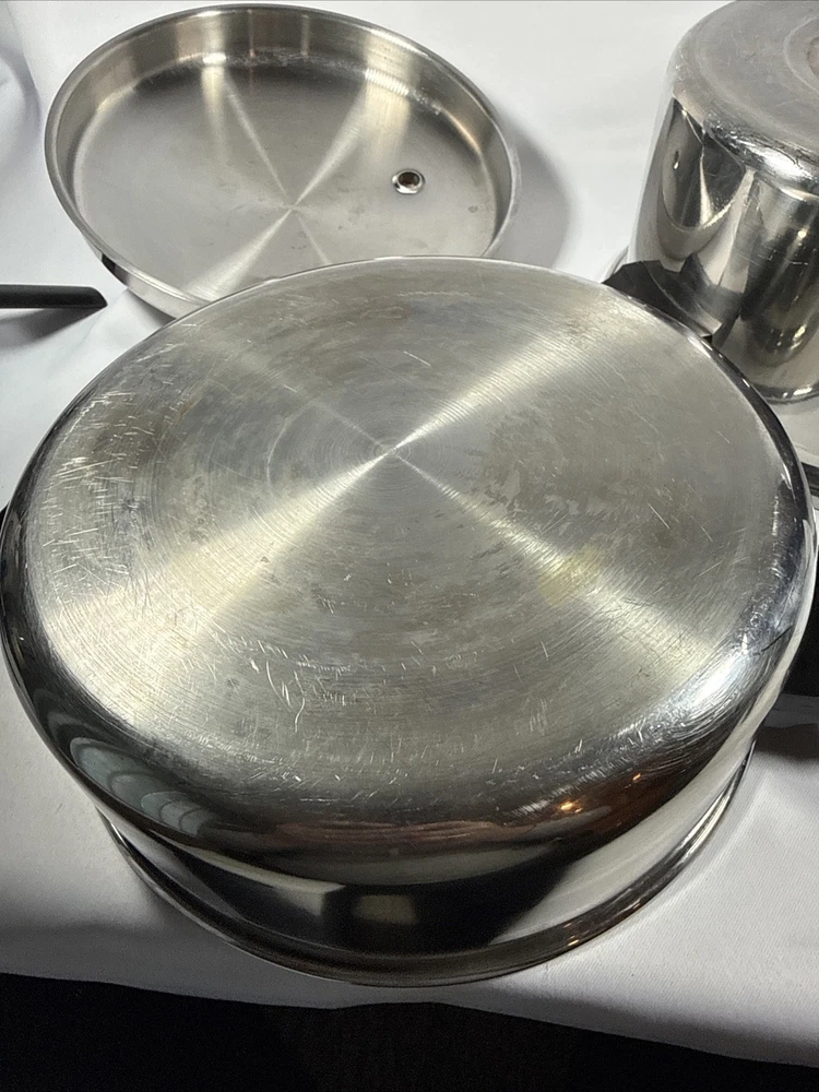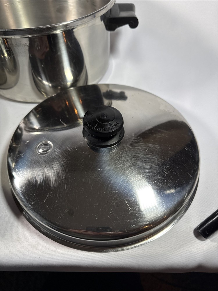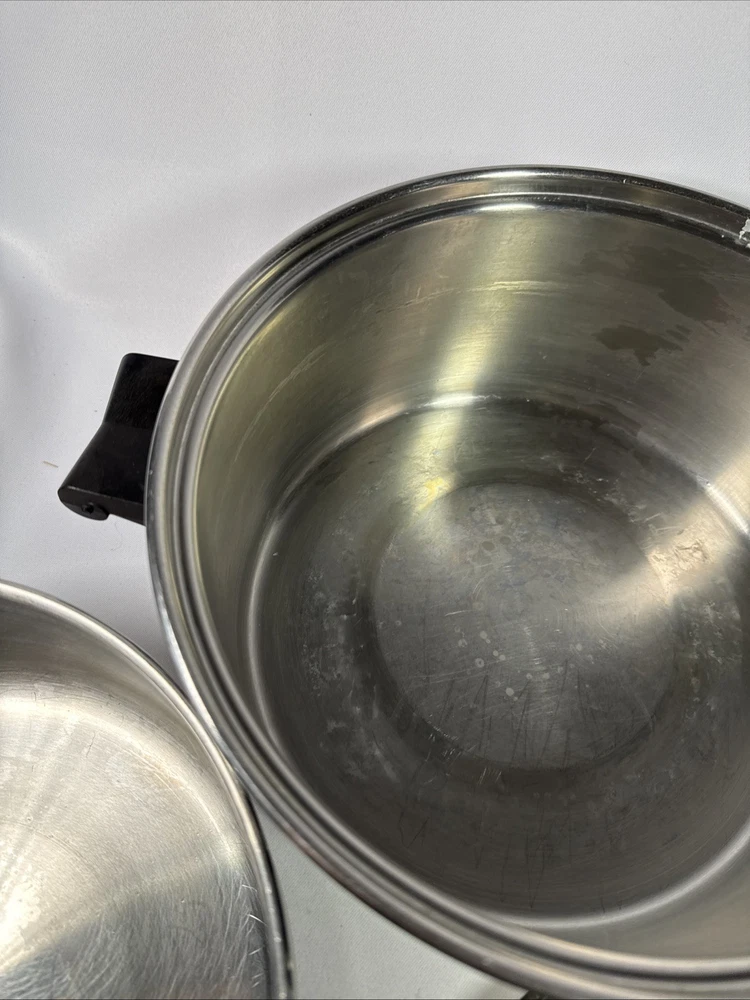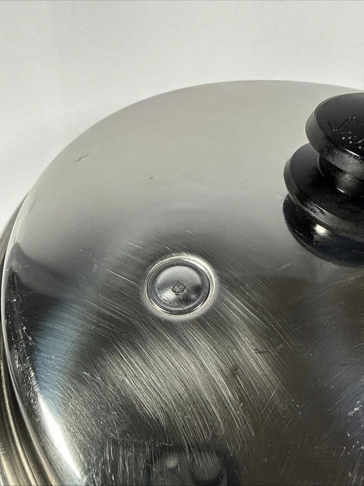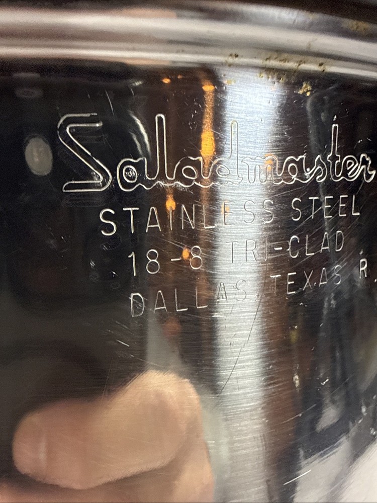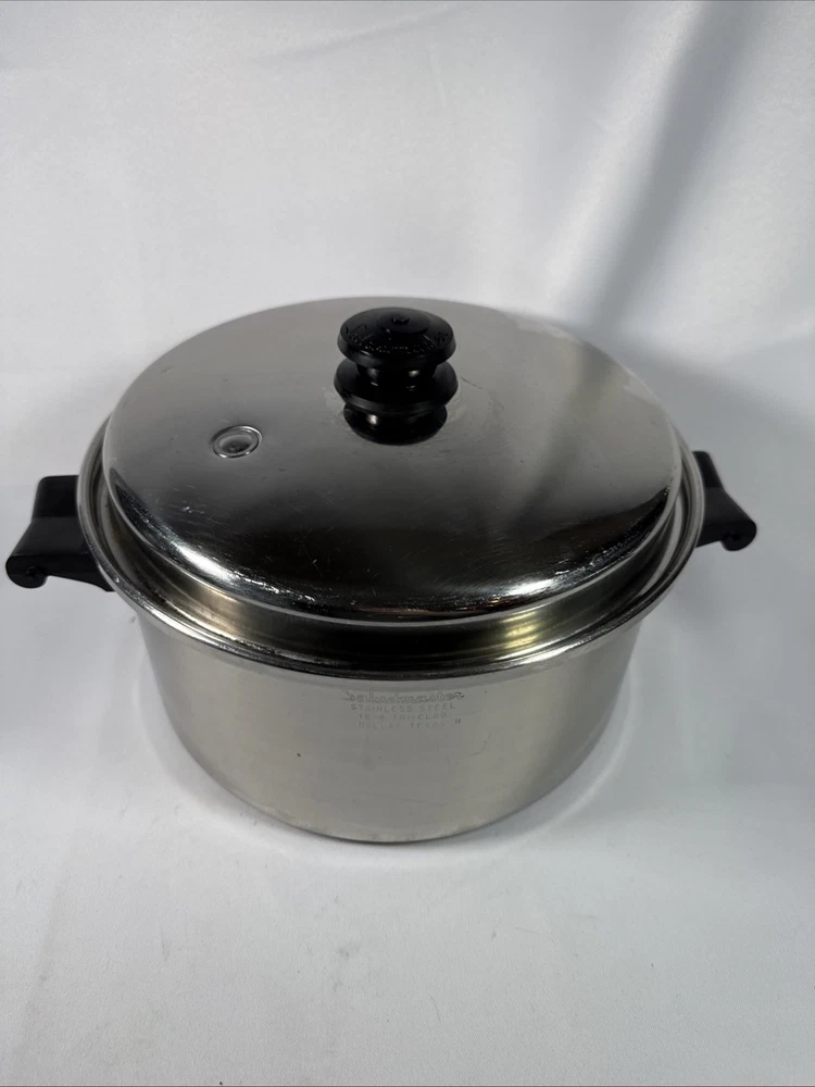 Saladmaster Stainless Steel 18-8 Tri-Clad 6 Q Stock Pot with Vapo Lid & Domed Lid. Pre-owned and shows some wear, please see photos for condition. We do our best to describe in words as well as photographs the condition of our items. If you have any additional questions or you experience any issues regarding your order, please don't hesitate to contact us. We test all items, but sometimes items break/malfunction, especially vintage items. We are committed to ensuring your satisfaction and are here to help resolve any concerns. Thank you again for choosing us, and we look forward to serving you in the future!