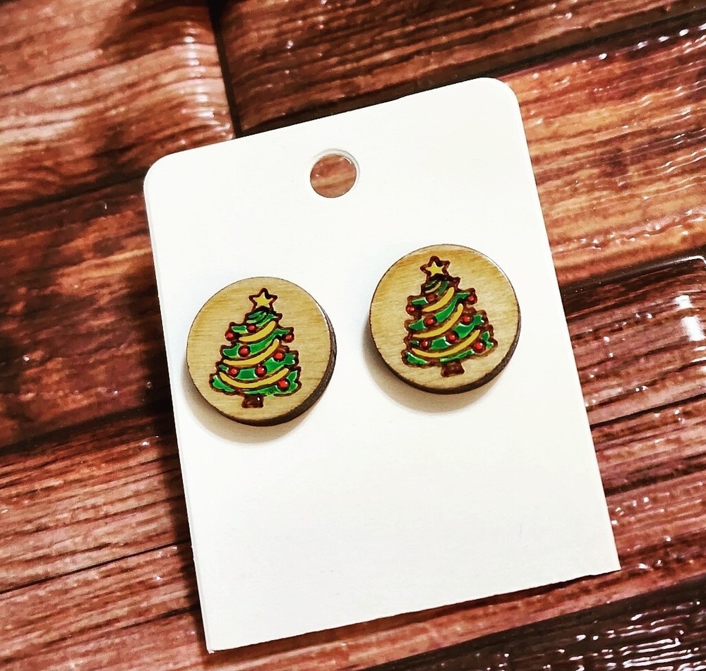Christmas Tree stud earrings Laser cut, engraved and handpainted Earrings measure 1/2" Nickel Free backing Light weight for daily wear Please do not submerge earrings in water. Gently wipe with damp rag °°°°°°°°°°°°°°°°°°°°°°°°°°°°°°°°°