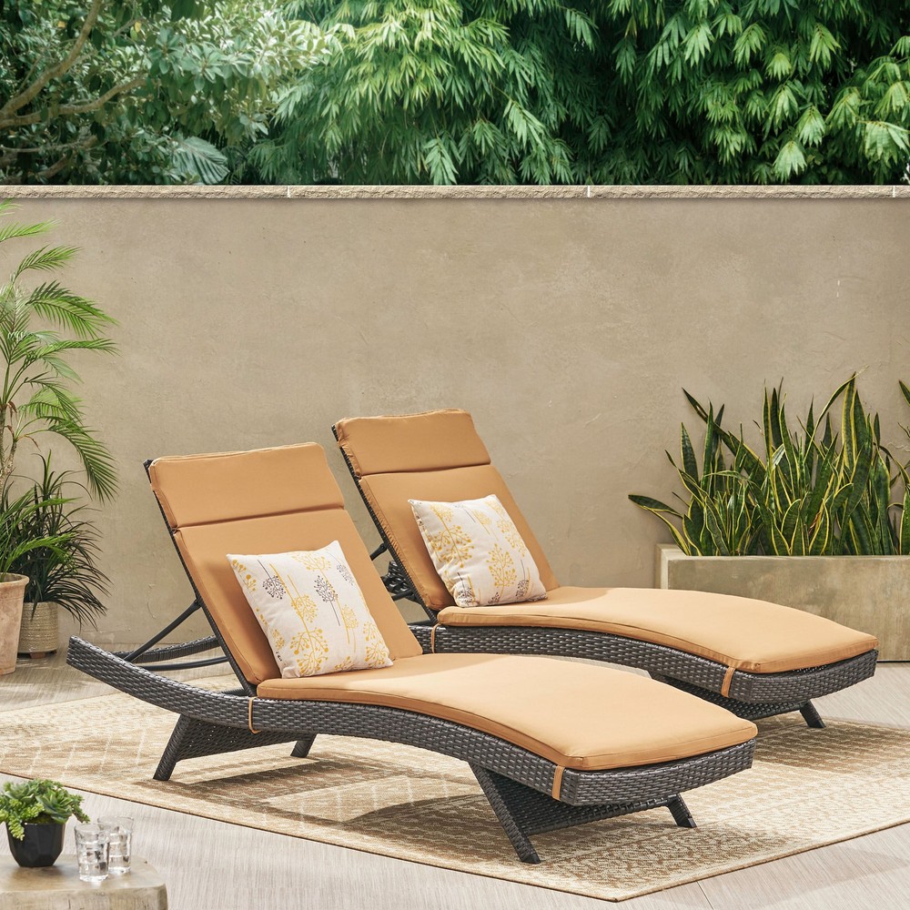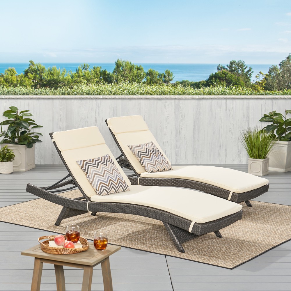 Relax outdoors with this adjustable Salem chaise set from Christopher Knight Home. The sleek frame is constructed from weather-resistant wicker and features an adjustable back for ultimate comfort. A UV-resistant polyester cushion tops the entire seat and is available in 13 colors for a custom look. Features: Includes: Two (2) Lounge Chairs and Two (2) Cushions Material: Iron and Polyethylene Wicker Cushion Material: Water Resistant Fabric Fabric Composition: 100% Polyester Wicker Finish: Multiple Options Cushion Color: Multiple Options No Assembly Required Lounge Dimensions: 79.25 inches deep x 27.50 inches wide x 15.00 inches high Cushion Dimensions: 80.00 inches deep x 27.50 inches wide x 1.50 inches high Free Shipping Over $49.99* Details Salem Outdoor Wicker Lounge with Water Resistant Cushion (Set of 2) by Product Description: Relax outdoors with this adjustable Salem chaise set from Christopher Knight Home. The sleek frame is constructed from weather-resistant wicker and features an adjustable back for ultimate comfort. A UV-resistant polyester cushion tops the entire seat and is available in 13 colors for a custom look. Features: IncludesTwo (2) Lounge Chairs and Two (2) Cushions MaterialIron and Polyethylene Wicker Cushion MaterialWater Resistant Fabric Fabric Composition100% Polyester Wicker FinishMultiple Options Cushion ColorMultiple Options No Assembly Required Lounge Dimensions79.25 inches deep x 27.50 inches wide x 15.00 inches high Cushion Dimensions80.00 inches deep x 27.50 inches wide x 1.50 inches high