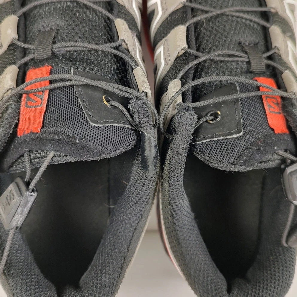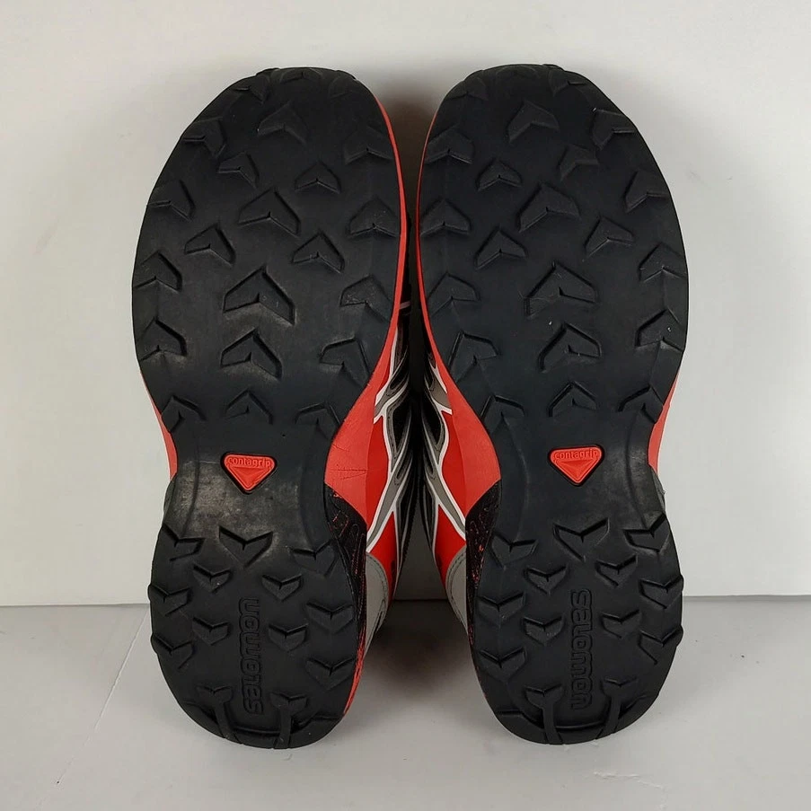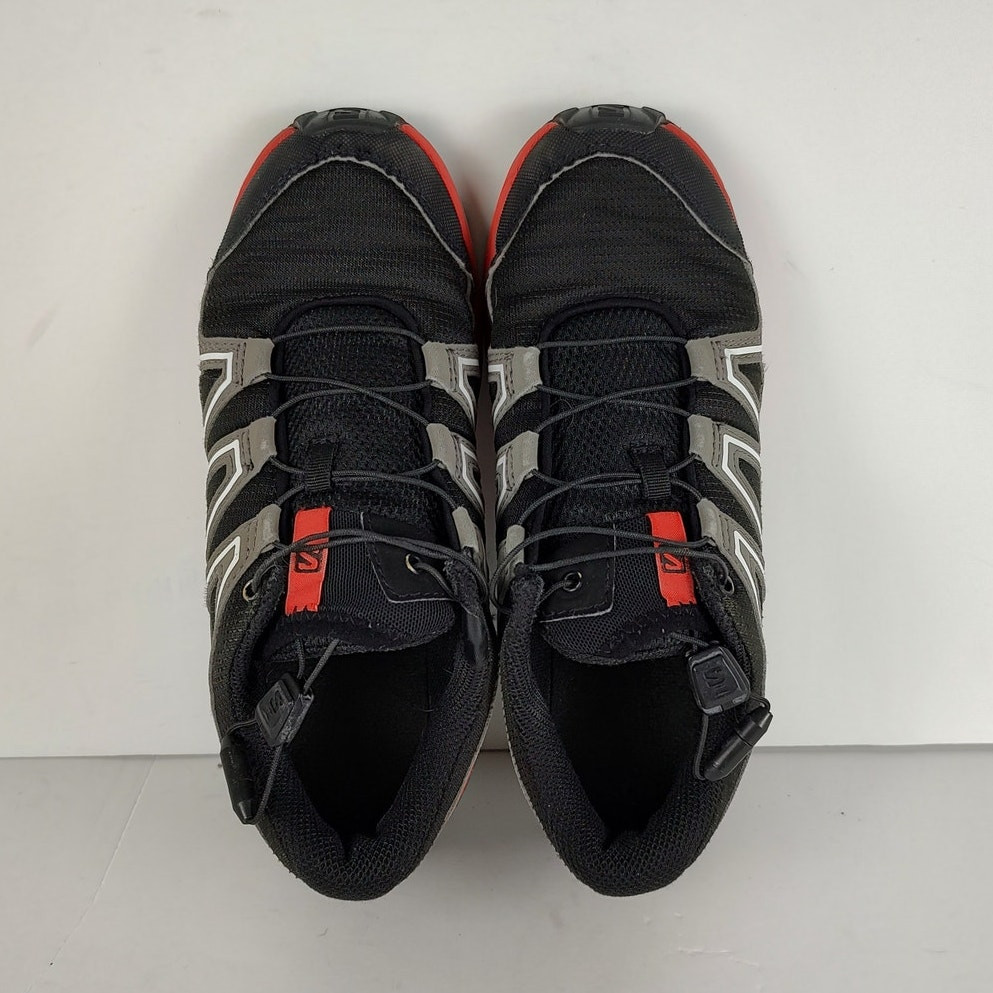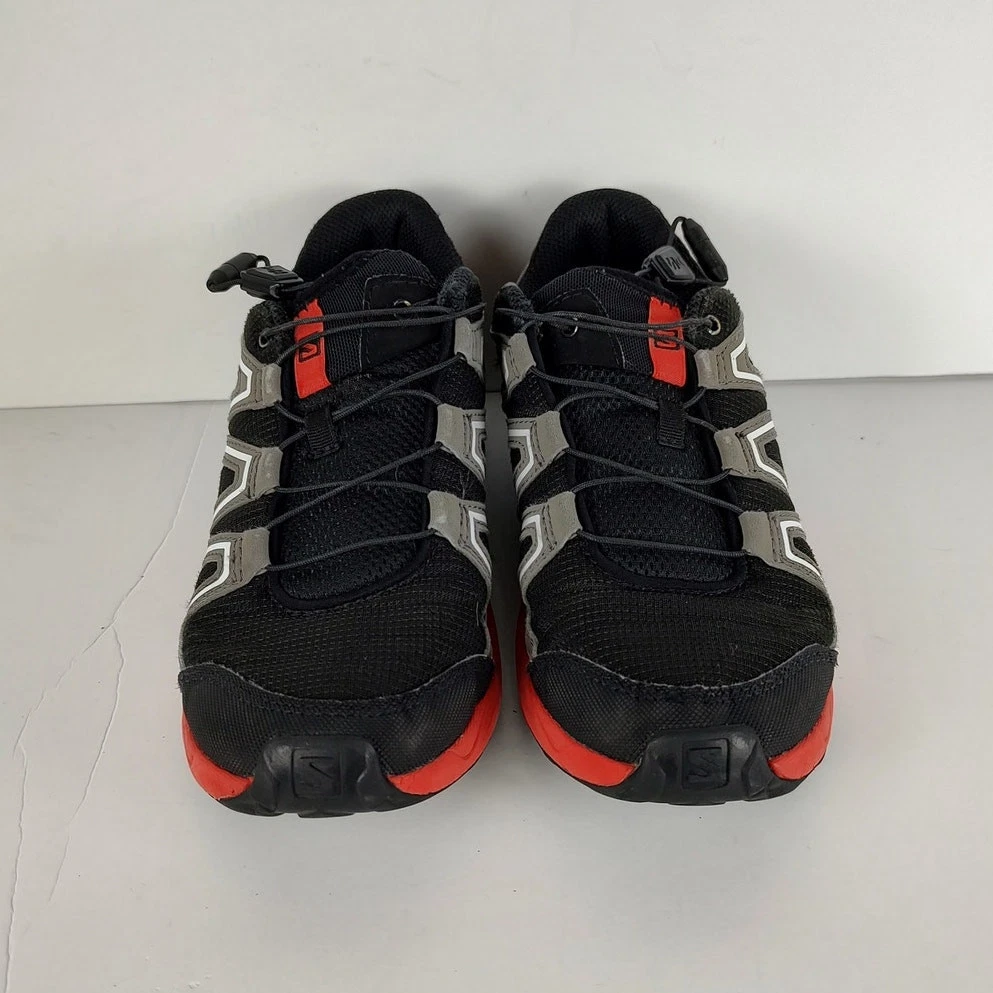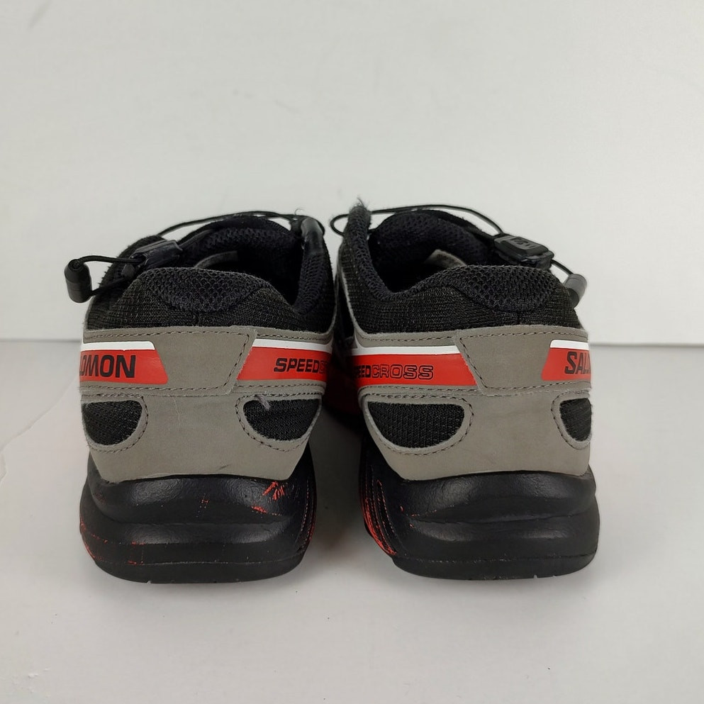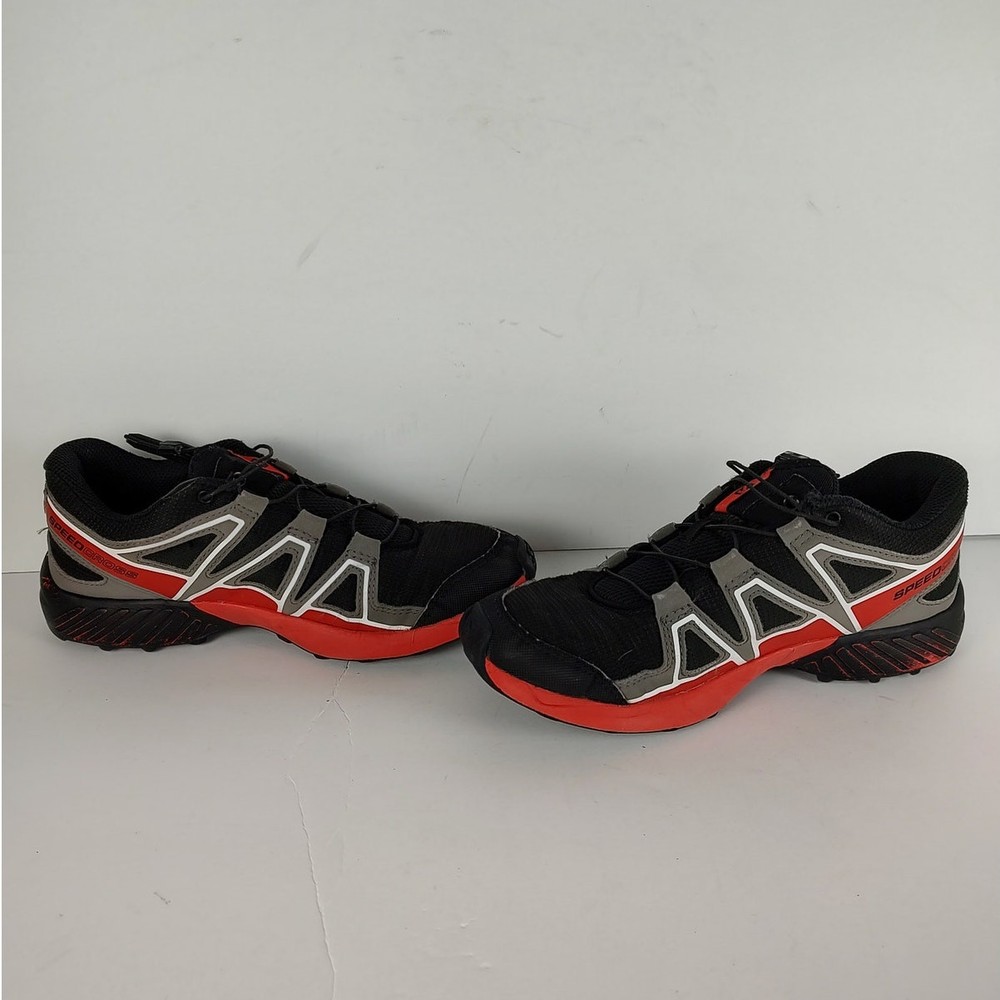 Salomon Boys Speedcross J Black red Running Shoes Sneakers Size 4 has a patch on the lip of the left shoe other than that in pretty good condition Has been thoroughly cleaned before listing Refer to pictures before purchasing as all defects are shown