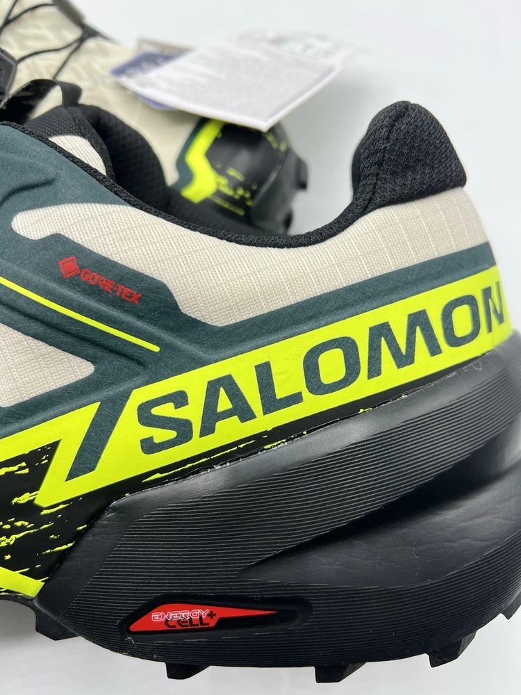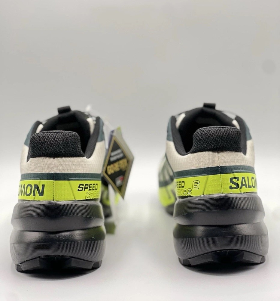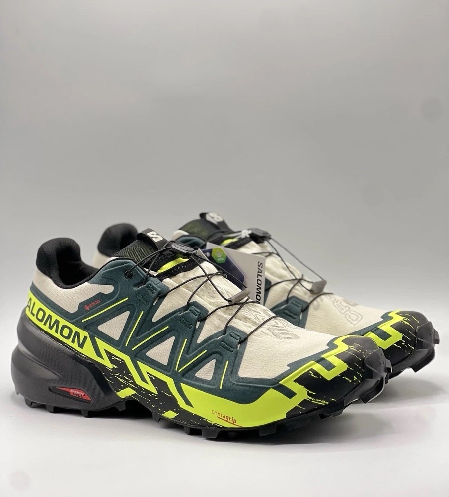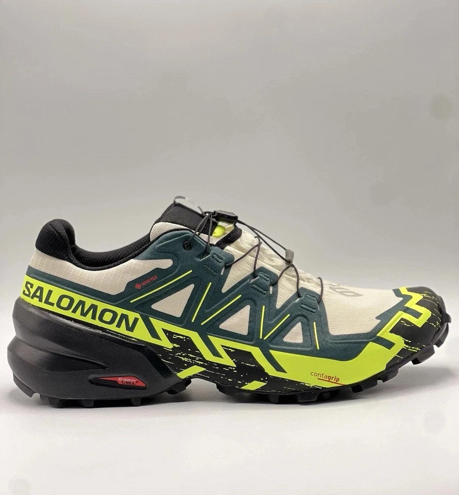 Experience the great outdoors with these Salomon Speedcross 6 sneakers. Designed for men, these athletic shoes come in a vibrant green color with a colorblock pattern. The Goretex upper material is waterproof and lightweight, making them perfect for hiking, trail running, and cross-training activities. These sneakers feature a low-top shoe shaft style and standard shoe width, with a cushioned and adjustable fit that provides comfort and performance. The rubber outsole material is suitable for gym and training, walking, school, and running and jogging. These Salomon Speedcross 6 sneakers are perfect for those who love nature and sports.