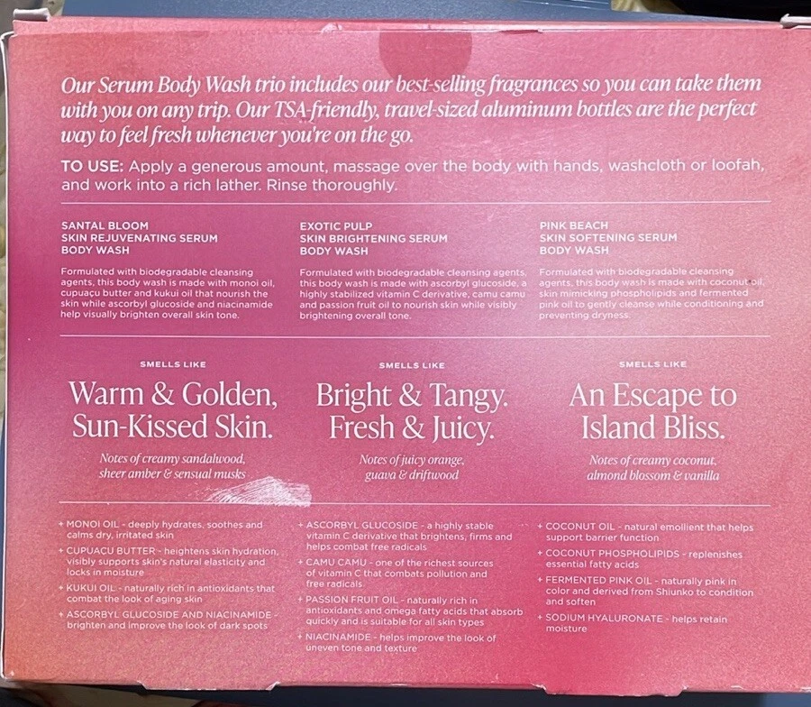 Saltair Serum Body Wash Travel 3 Piece Gift Set 3 fl oz each Scents: santal bloom, exotic pulp, pink beach New, never used. Perfect condition.