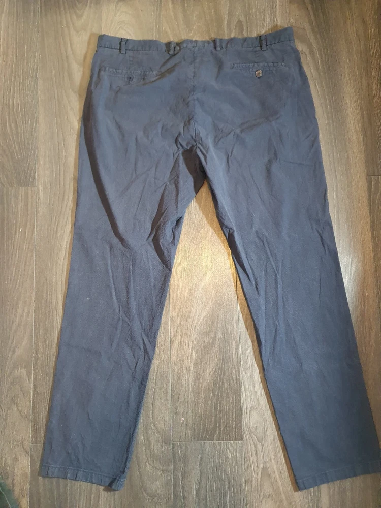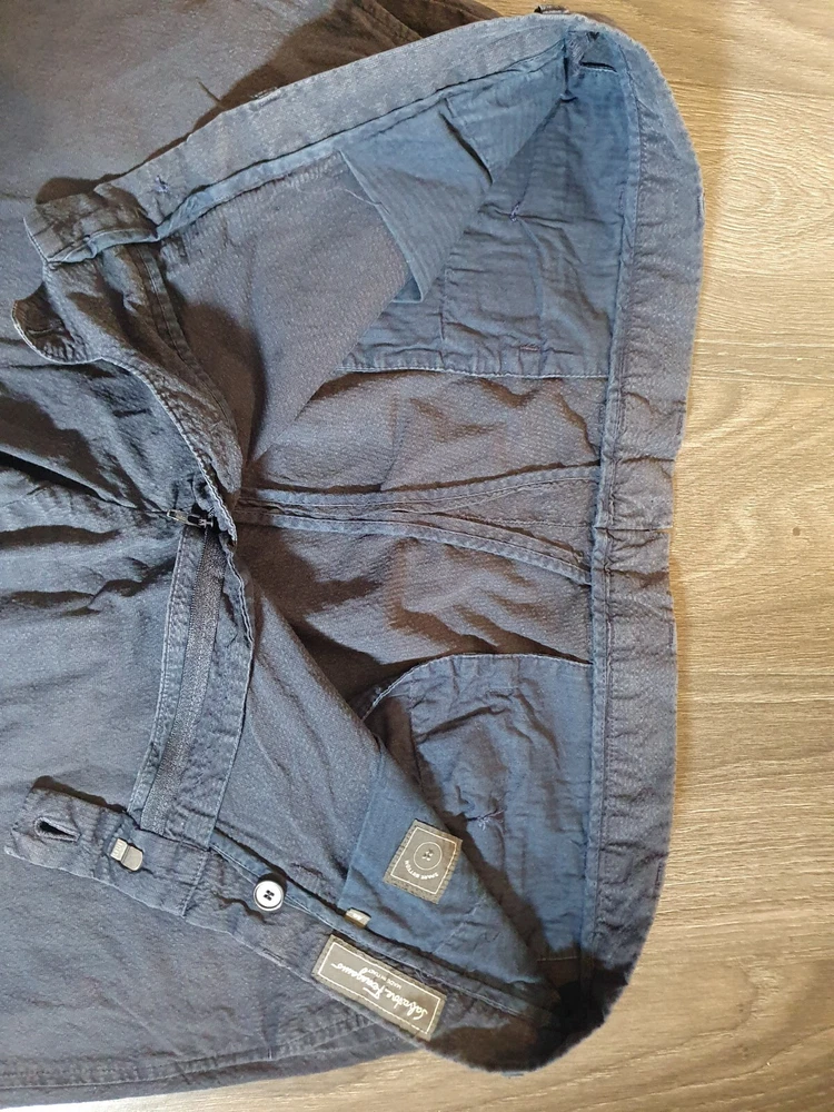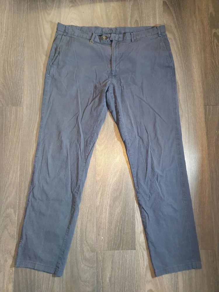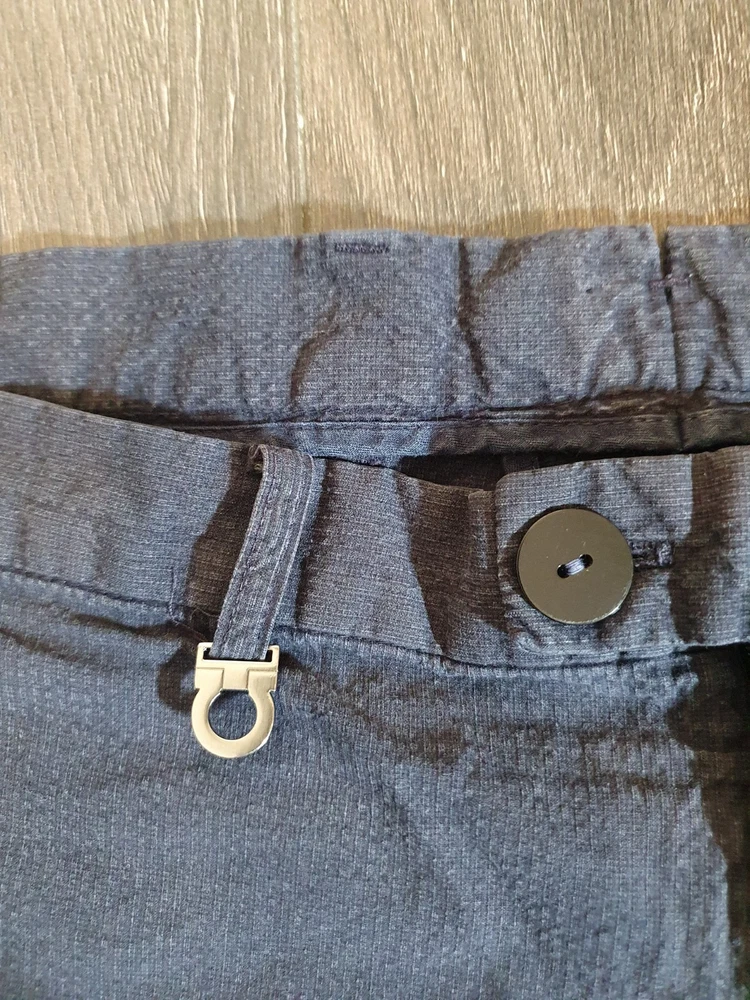 These Salvatore Feragamo linen trousers in a relaxed fit, size regular, are a stylish addition to any wardrobe. With a zip closure and waist size of 39 inches, they provide comfort and flexibility. The trousers have a stylish chino design and are made of high-quality linen material in a beautiful blue shade.