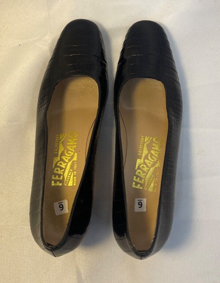 Salvatore Ferragamo Black Croc Print Leather Low Heel Shoes Size 6