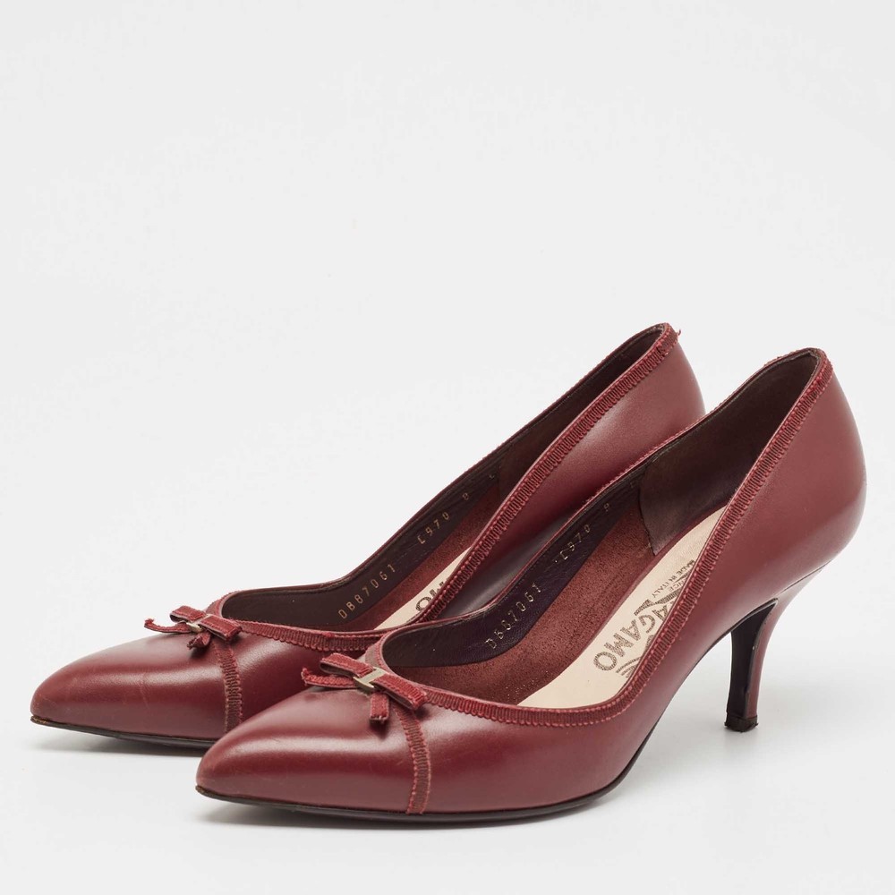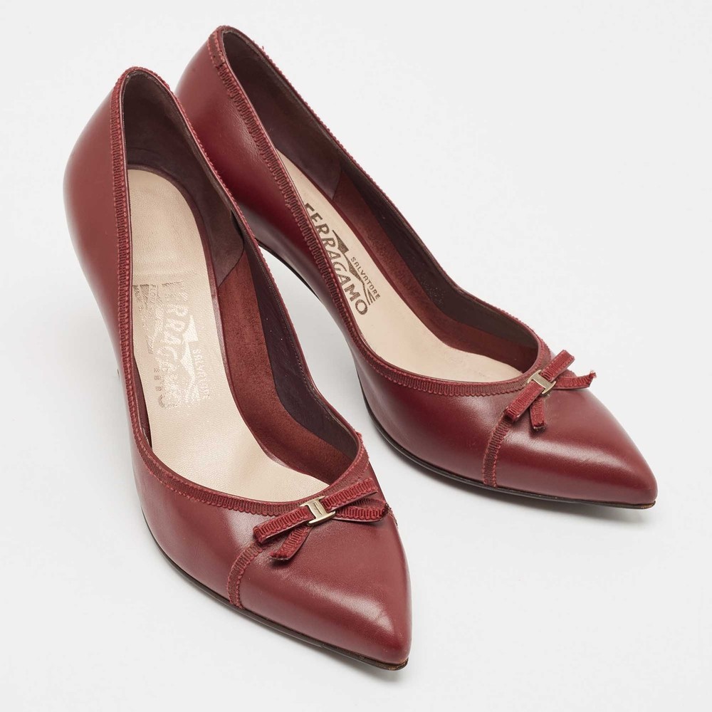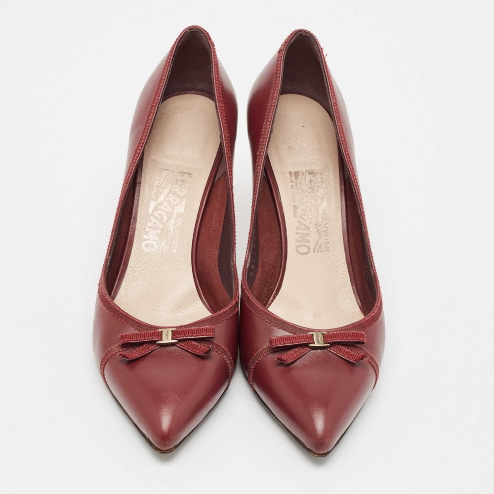 Exuding timeless charm, these Salvatore Ferragamo pumps are crafted from rich burgundy leather. The signature bow detail at the vamps add a feminine and refined touch. Completed with platforms and 10cm heels, they provide a perfect blend of style and comfort for everyday elegance.Certified by The Luxury Closet - This item has gone through a detailed authentication process overseen by our experts. We offer a lifetime guarantee of authenticity on all our items. Import duties, taxes and charges are not included in the item price. These charges are the buyers responsibility. Please check with your country’s customs office to determine what these additional cost will be prior to buying. Our eBay Store About Us Contact Us Add to Favorite Sellers Salvatore Ferragamo Burgundy Leather Bow Pumps Size 38.5 $172.7 Exuding timeless charm, these Salvatore Ferragamo pumps are crafted from rich burgundy leather. The signature bow detail at the vamps add a feminine and refined touch. Completed with platforms and 10cm heels, they provide a perfect blend of style and comfort for everyday elegance. Product Details Brand Color Burgundy Dimensions Material Leather Size 38.5 Outsole Width 7 cm Outsole Length 22.5 cm Heel Height 10 cm Includes The Luxury Closet Packaging Certified by The Luxury Closet This item has gone through a detailed authentication process overseen by our experts. We offer a lifetime guarantee of authenticity on all our items. How We Check The in-house team of experts at The Luxury Closet is highly trained to verify the authenticity and the condition of the luxury products. They ensure that only 100% authentic items are put on sale.The evaluation process is unique with its own mix of assessment criteria and differs according to the category. Each item is evaluated based on the following combination of hallmarks, hardware, stitching, symmetry, material, craftsmanship, stamping, codes, hologram stickers, and packaging. Our authenticators also check if the items have been modified or amended (e.g., aftermarket diamonds, replaced batteries, repaired bags, etc.) International Buyers Import duties, taxes and charges are not included in the item price. These charges are the buyers responsibility. Please check with your country’s customs office to determine what these additional cost will be prior to buying.