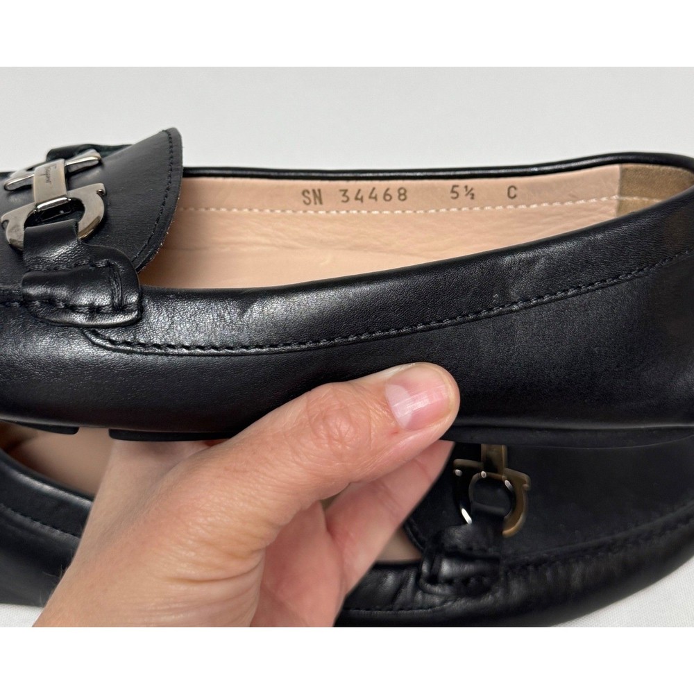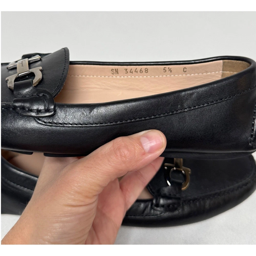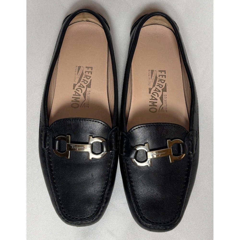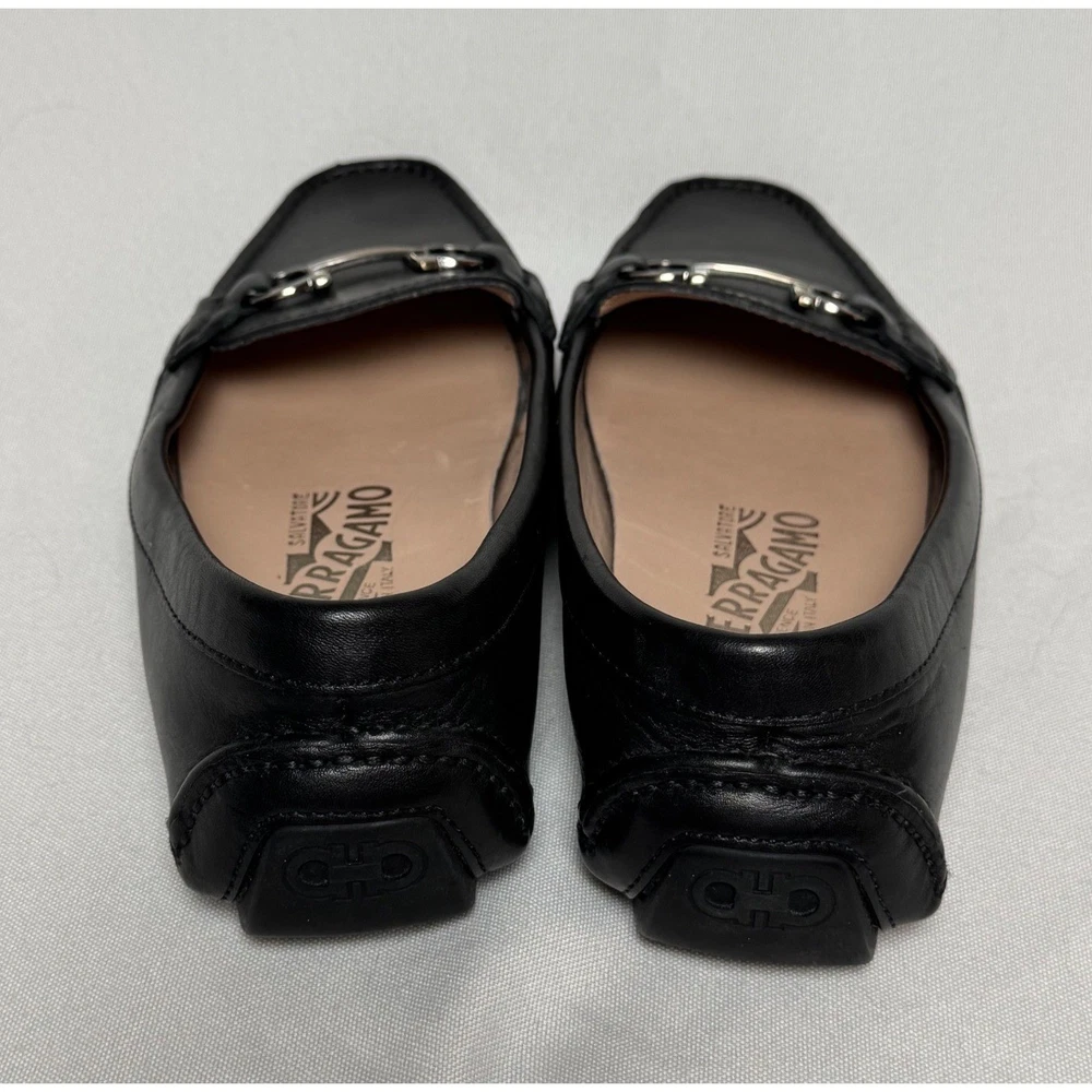 Salvatore Ferragamo Gancini loafers in smooth black leather offer a timeless silhouette with sophisticated silver-tone hardware. These Italian-crafted driving shoes feature the iconic double Gancini bit detail across the vamp and a pebbled rubber sole for comfort and durability. The interior is lined with supple tan leather, showcasing the brand's commitment to luxury craftsmanship. Measurements: • Insole Length: 9.25" Brand: Salvatore Ferragamo Material: Leather Color: Black Style: Loafers Hardware: Silver-tone Gancini Sole: Rubber Driving Sole Origin: Made in Italy Model Number: SN 34468 Keywords: Designer, Luxury, Italian, Quiet Luxury, Old Money, Professional, Business Casual, Classic, Minimalist, Preppy, Office Wear, Travel, Comfortable, Sophisticated