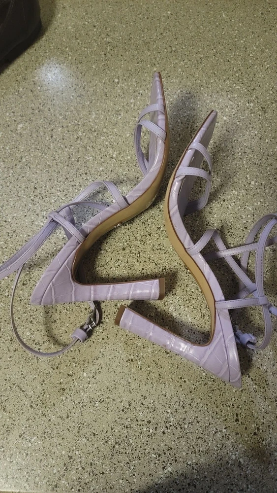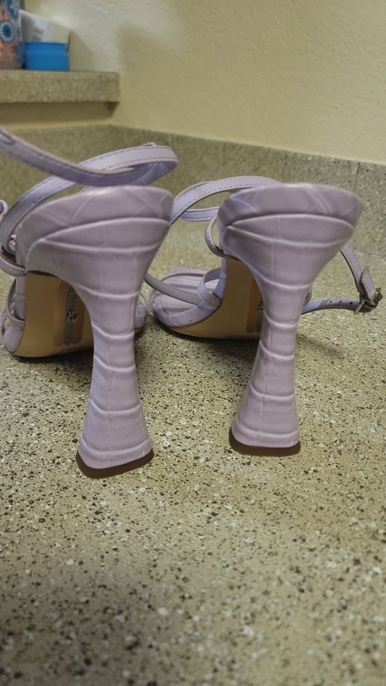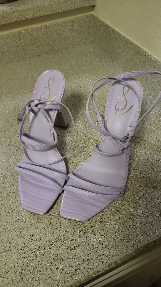 Sam Edelman Lela Sandal in Lilac Square Toe Flared Heel Size 10 Great pre owned condition Lela Strappy Heel Closure: Buckle Toe: Open Material: Leather Heel Height: 3.9 inches Retail $140 Smoke free cat friendly home