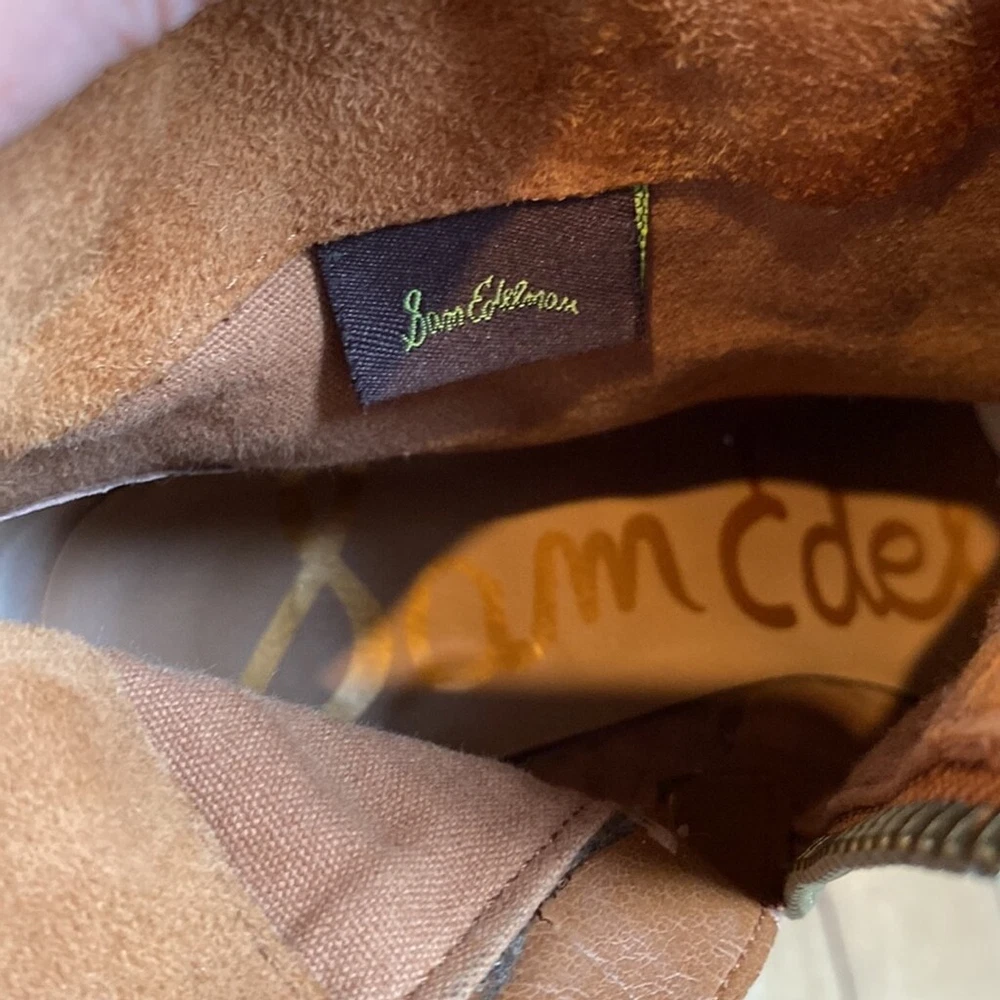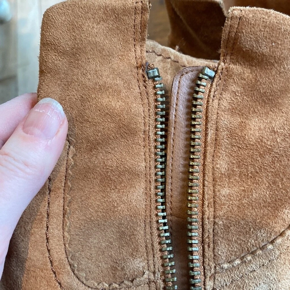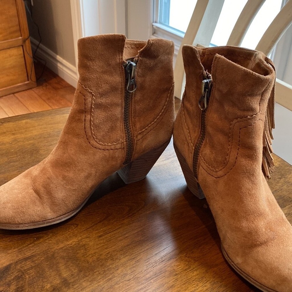 Sam Edelman Louie Western Boot Caramel Brown Suede Fringe US Size 7.5 Block Heel Super soft Heels and soles in very good condition Some little spots on one toe - noticeable close up Zippered- one inner zip is torn but doesn’t affect closure or look