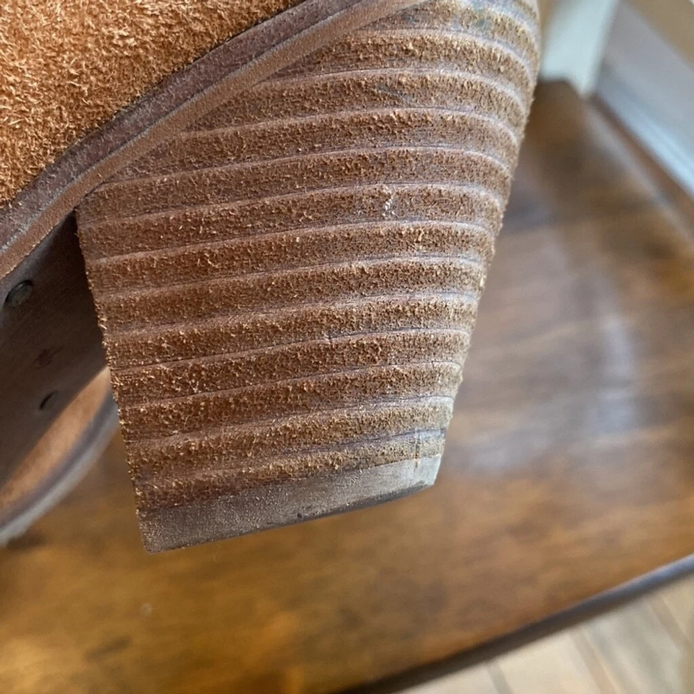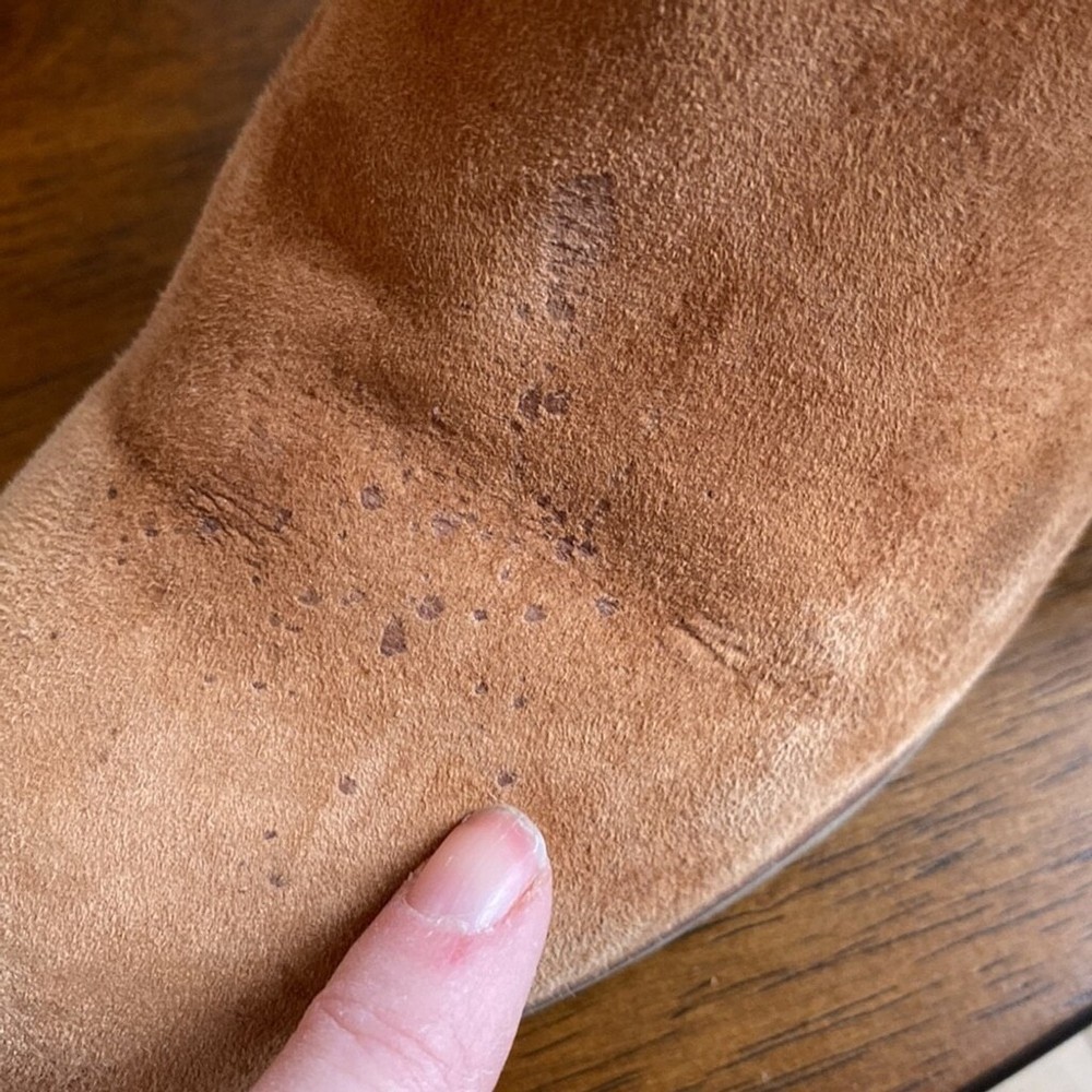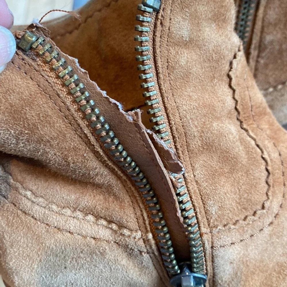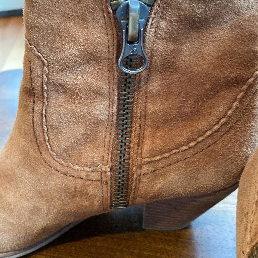 Sam Edelman Louie Western Boot Caramel Brown Suede Fringe US Size 7.5 Block Heel Super soft Heels and soles in very good condition Some little spots on one toe - noticeable close up Zippered- one inner zip is torn but doesn’t affect closure or look