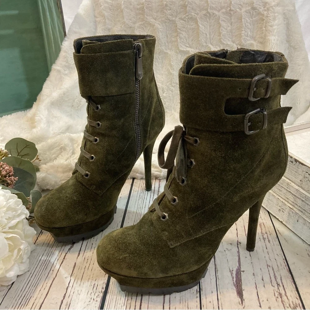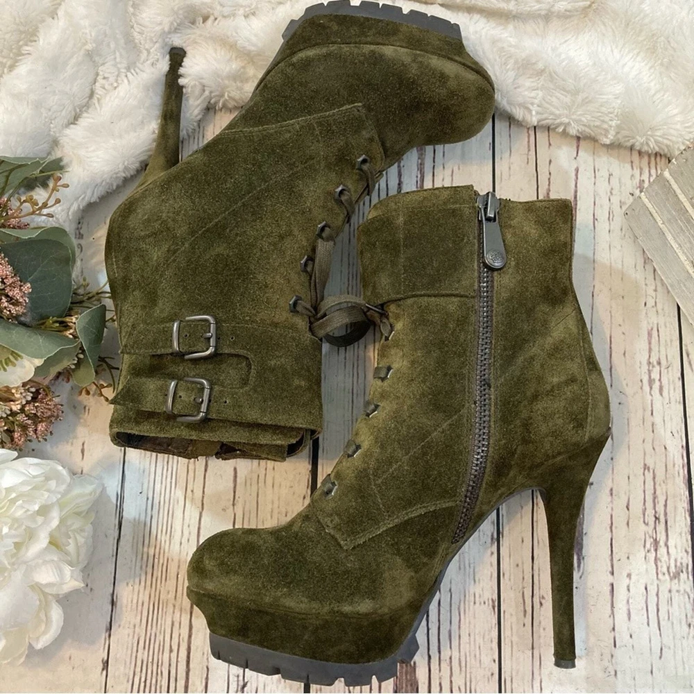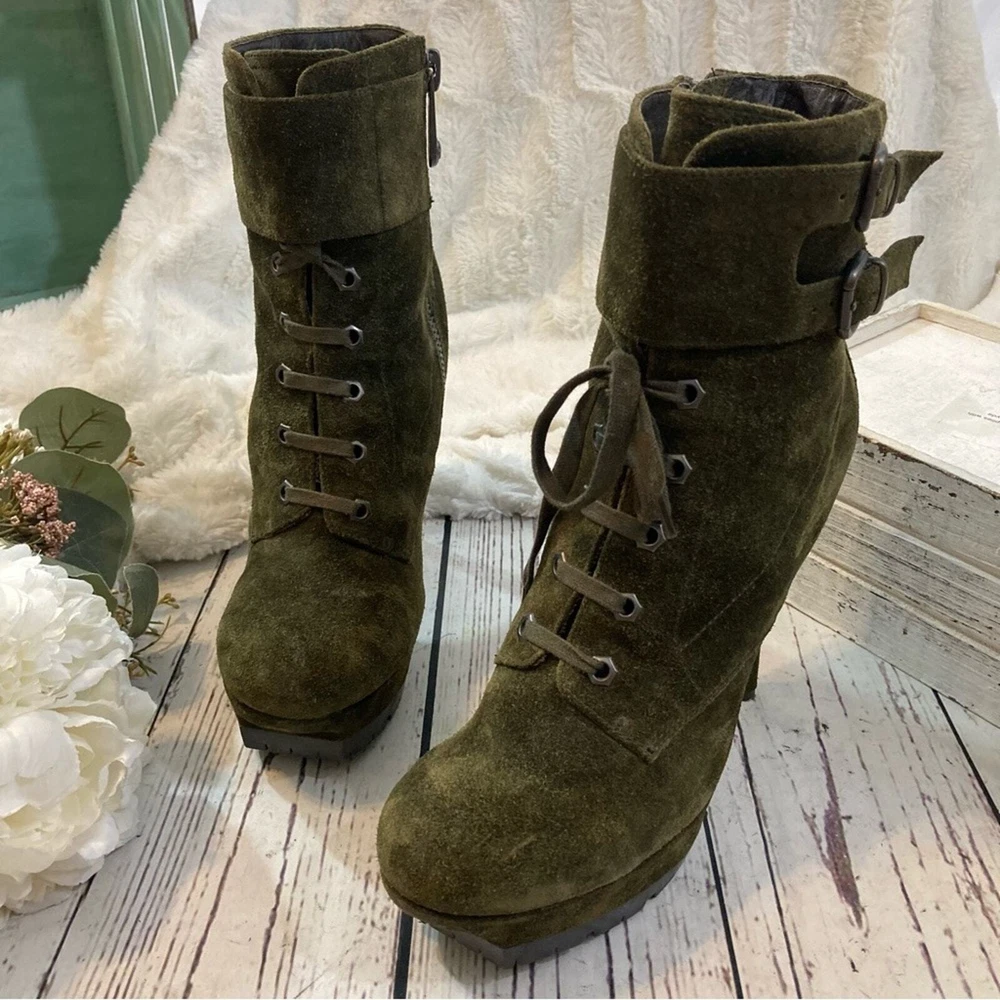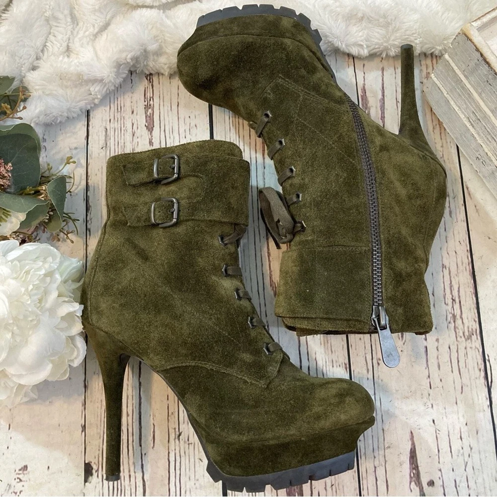 Pre loved Sam Edelman Vancouver olive lace up heeled combat boots . Suede . Super cute . Minimal wear . Size 9 . Heel 5.5 inch . Grip outsole . Non slip . Shipped with USPS Priority Package, No returns but backed by eBay money back guarantee. If you have any other questions please contact seller . Please leave wonderful feedback once you are satisfied with the purchase, Thank you. Custom charges may apply for international purchases.