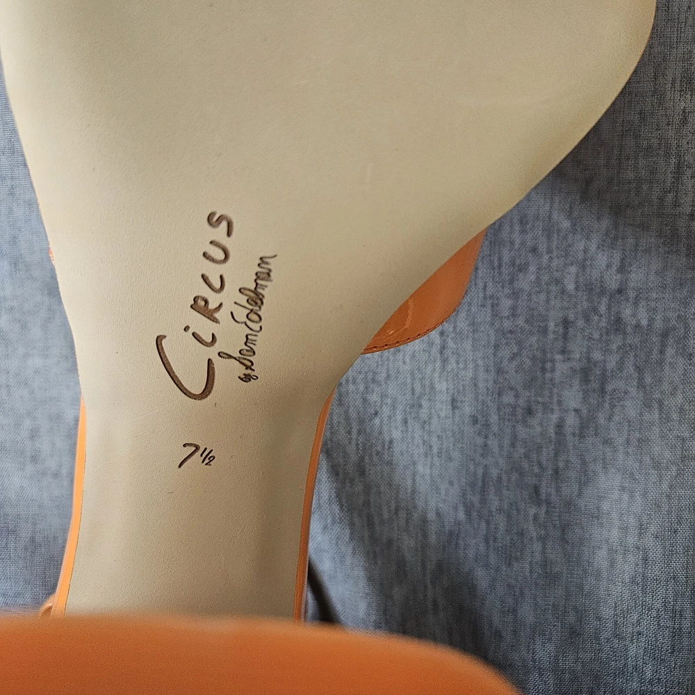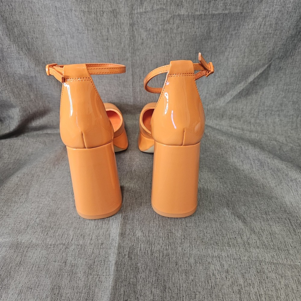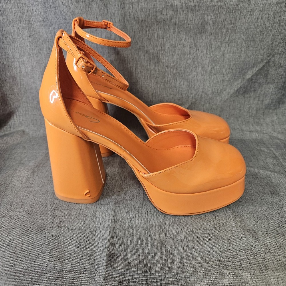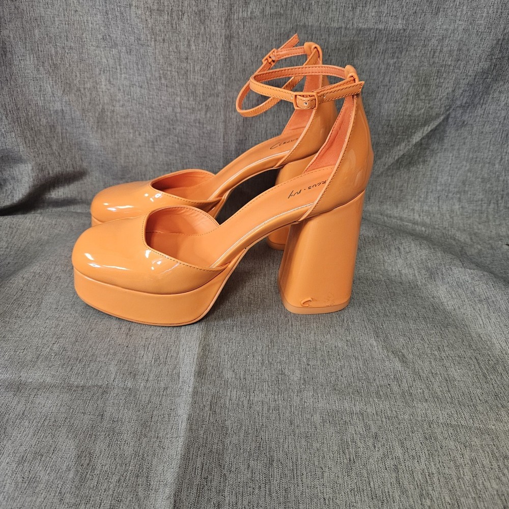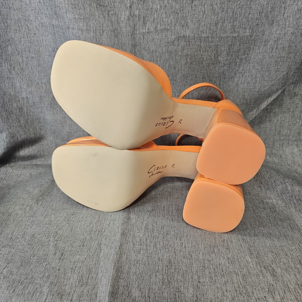 These are Circus by Sam Edelman Rosa platform pumps in vibrant orange, featuring a square toe, high block heel, and ankle strap with buckle closure. The shoes are in size 7.5M (US) or 40.5 (EU), with a heel height of 3-3.9 inches. They are designed for a night out or clubwear, with a solid color and synthetic upper material.