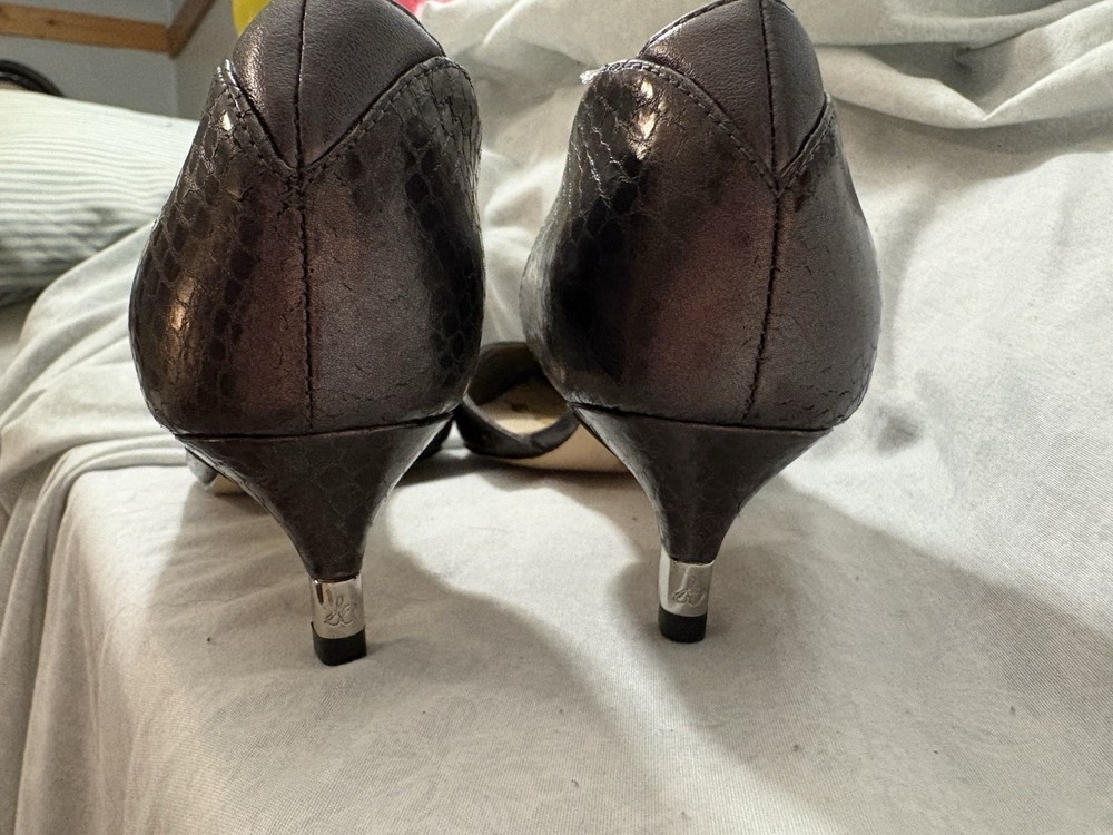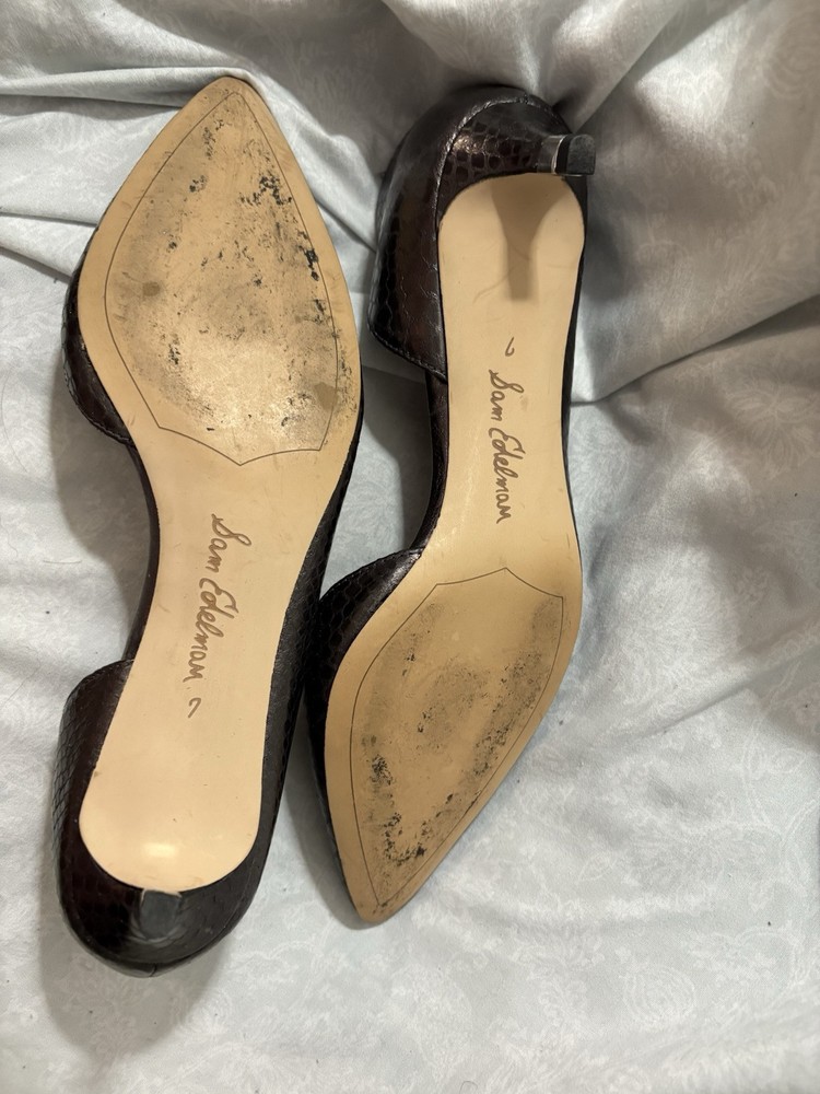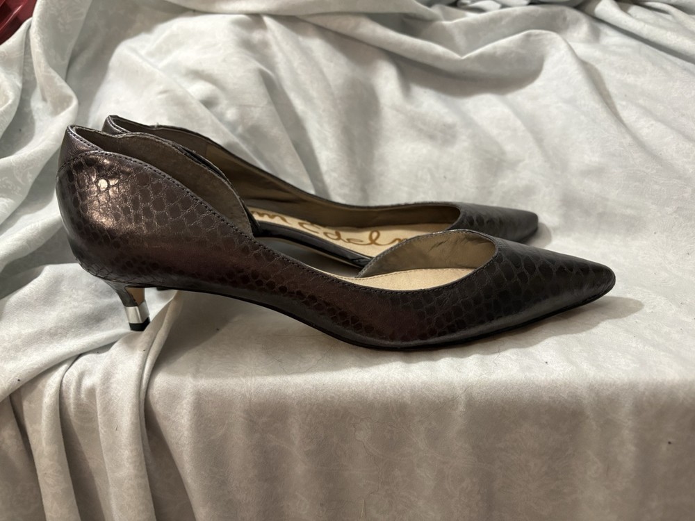 Closure: Slip On Vintage: No Color: Black Department: Women US Shoe Size: 7 Style: Pump Type: Heel Heel Height: High (3-3.9 in) Upper Material: Leather Customized: No Brand: Sam Edelman Toe Shape: Pointed Toe Pattern: Animal Print Heel Style: Kitten Country/Region of Manufacture: China