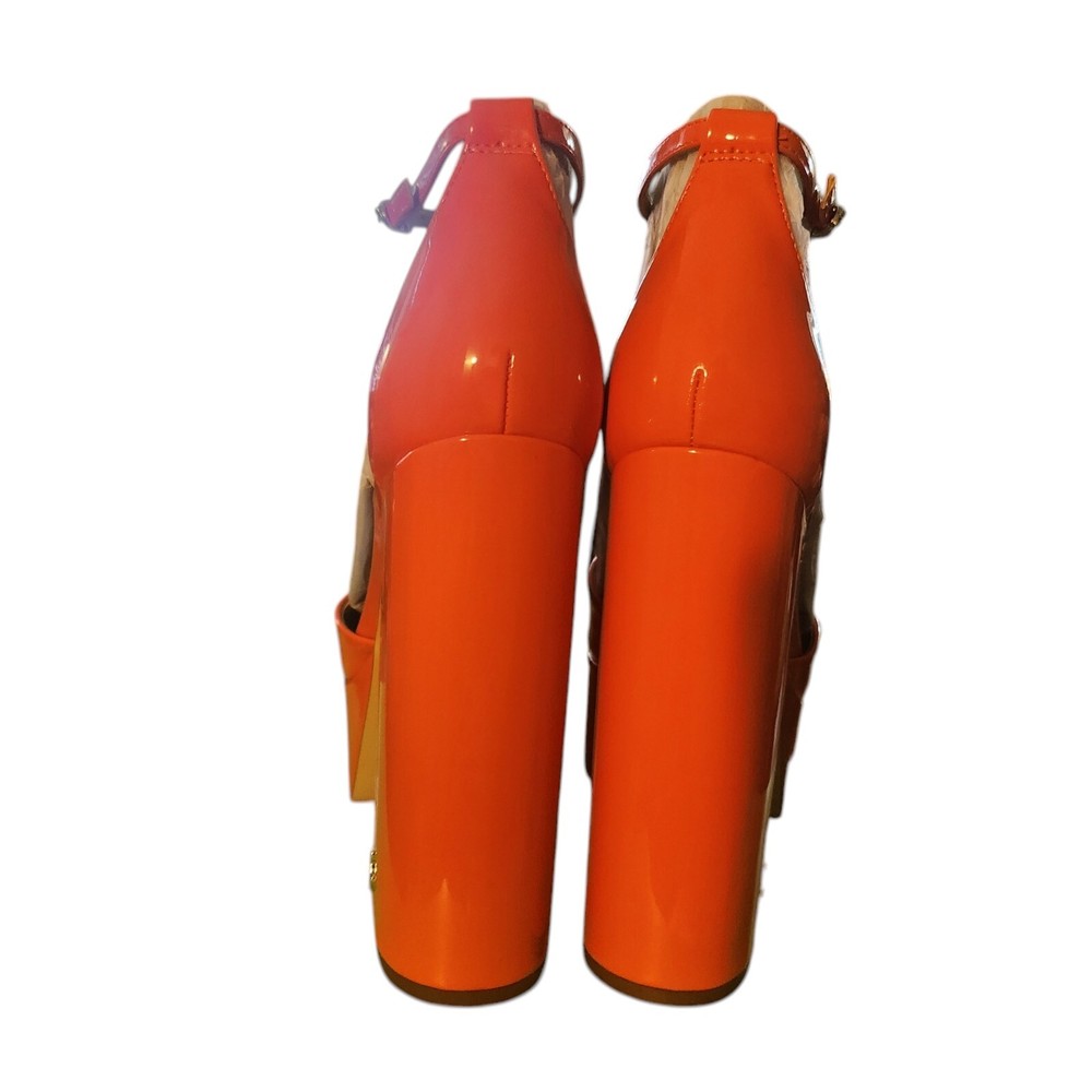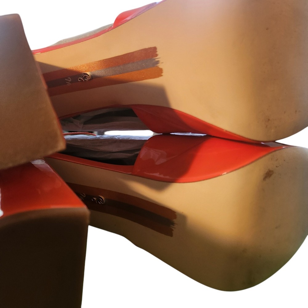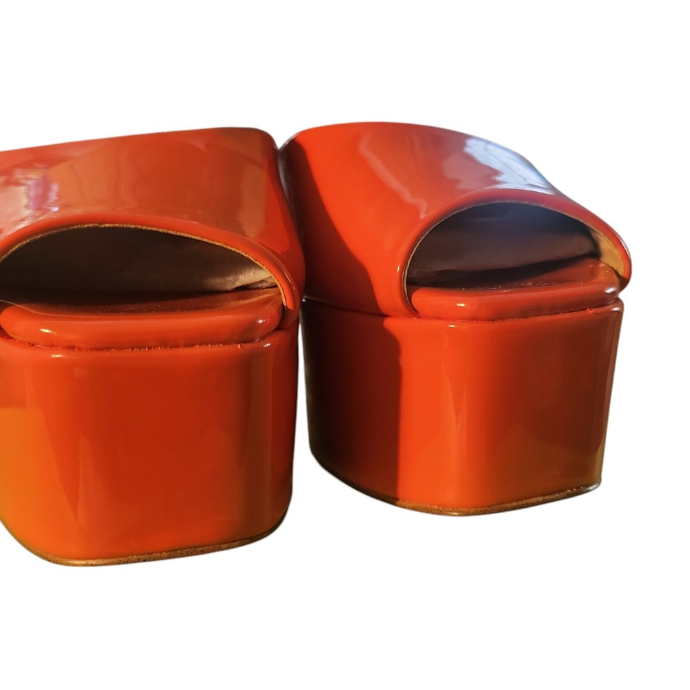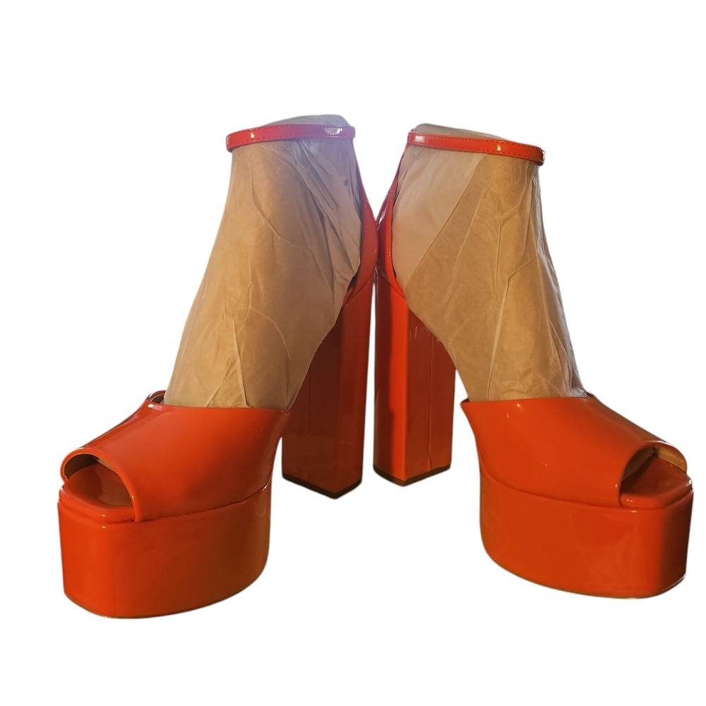 Sam Edelman Women's Orange Platform Heels in size 7.5, featuring an open toe design with a buckle closure. These ultra high heels have a 2-inch platform height and a block heel style. These solid orange heels are perfect for any occasion. Slight wear on bottom from trying on.