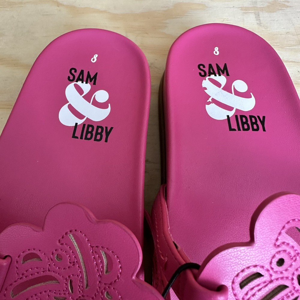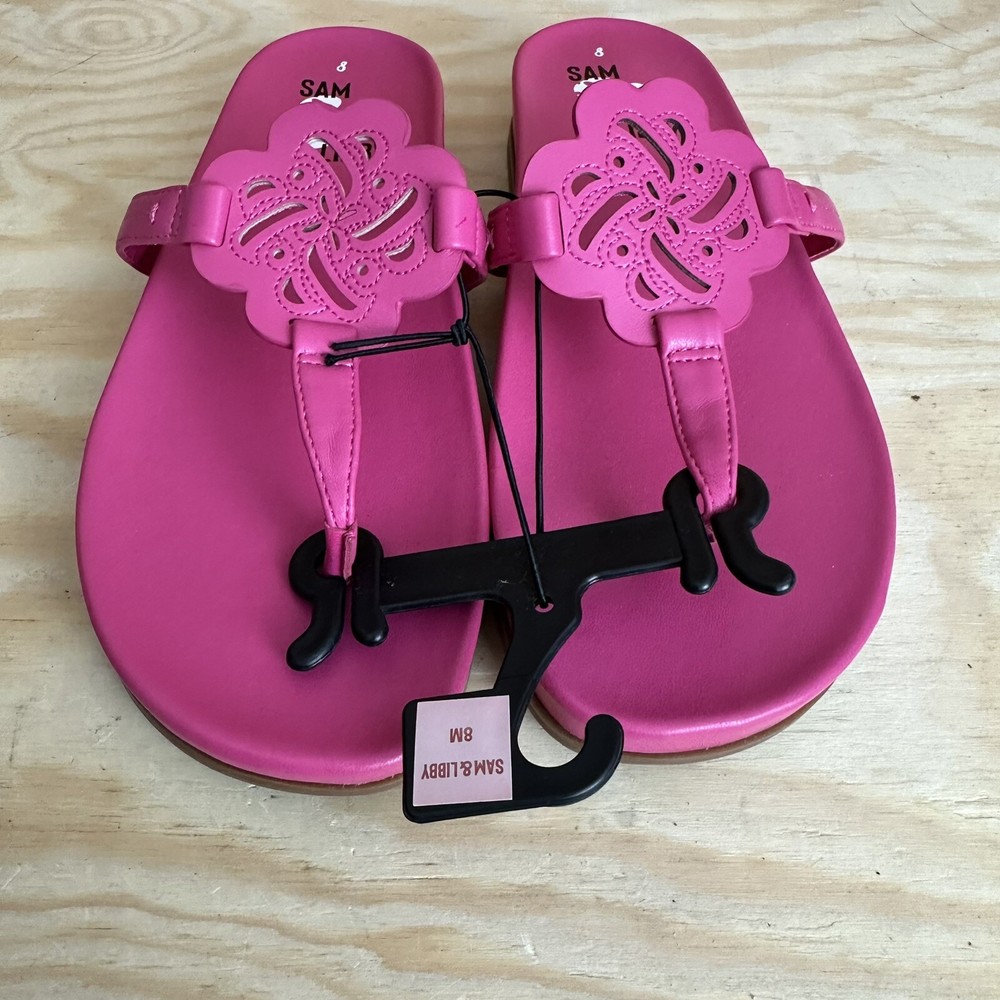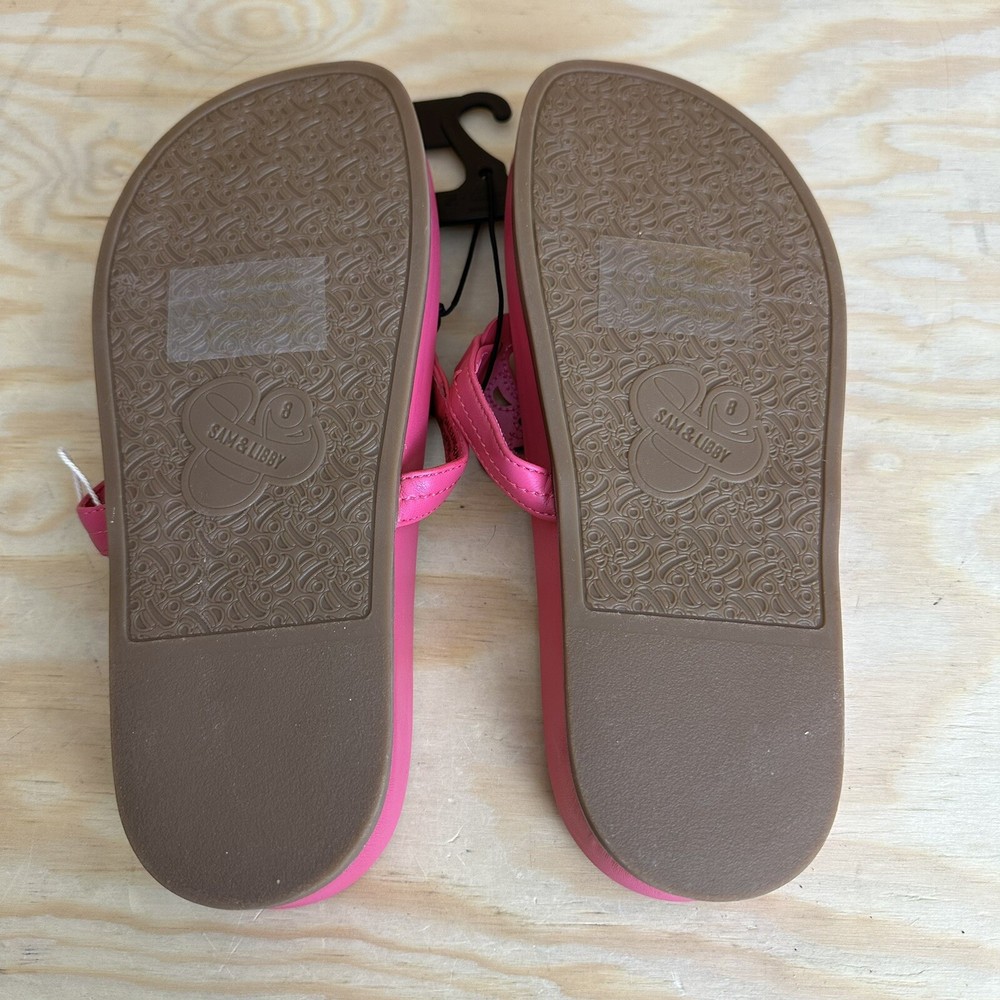 Model: Thong Department: Women Character: Sandal Features: Cushioned Heel Style: Sandal Style: Flip Flop Color: Pink Type: Sandal Upper Material: Faux Leather Closure: Slip On Brand: Sam & Libby US Shoe Size: 8