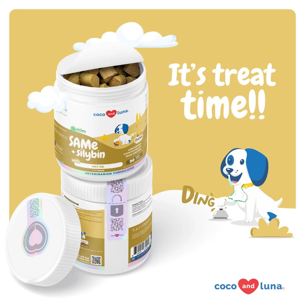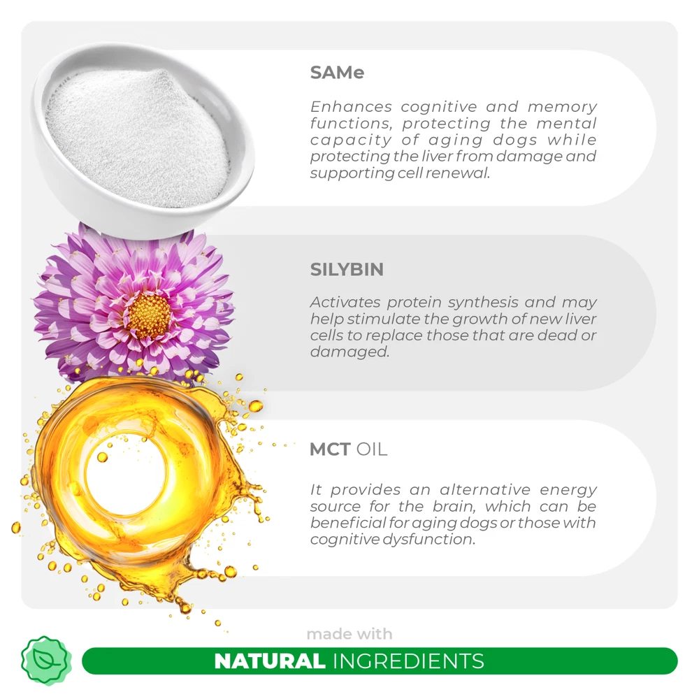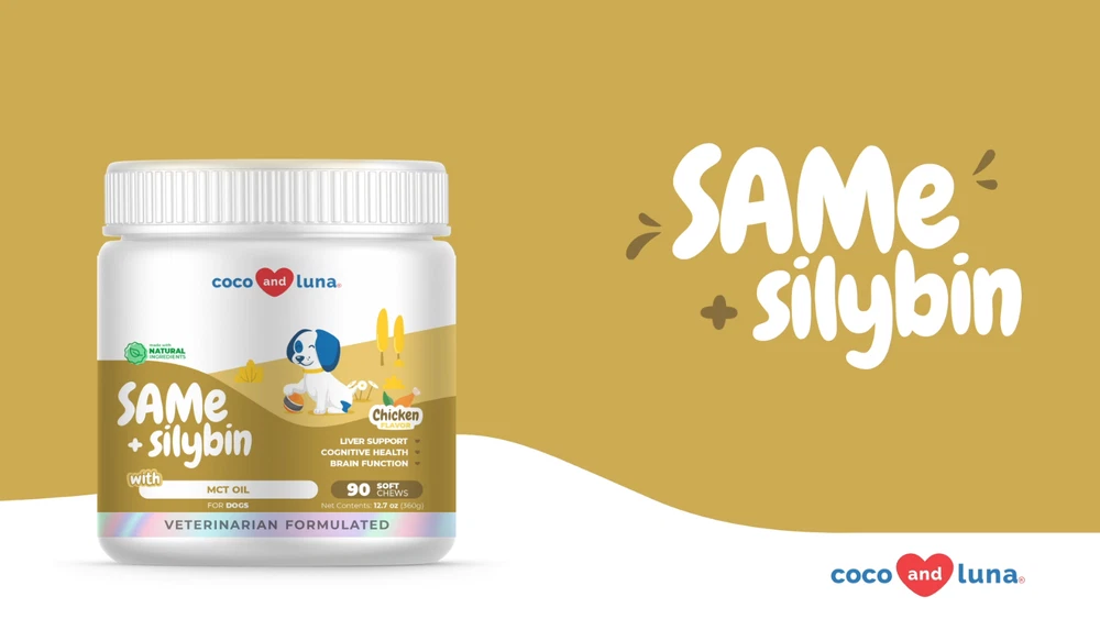 SAMe is a crucial compound involved in various biochemical reactions, including the transfer of methyl groups, which are essential for the functioning of enzymes, neurotransmitters, and other molecules in the body. It is a versatile and beneficial supplement for dogs that can support liver health, joint function, mood and behavior, cognitive function, and immune system balance. Silybin, derived from milk thistle seeds, is a versatile natural compound called a flavonoid and has numerous potential health benefits for dogs. Its antioxidant, anti-inflammatory, liver-protective, and detoxifying properties make it a valuable supplement in canine liver support. Silybin can be a useful tool in supporting your dog's liver function and overall health and managing various health conditions. MCT (medium-chain triglyceride) oil may help improve the absorption of certain ingredients, such as SAMe (S-adenosylmethionine) or Silybin, in a dog's body due to its unique properties and benefits for nutrient absorption. Our product is Veterinarian Formulated and is free from Palm Oil, Corn, Soy Derivatives, Artificial Flavors, and Preservatives. Prioritize your dog's health the natural way. Liver Support for Dogs - Our dog liver supplement promotes overall liver care for dogs by protecting it from damage, being a great dog liver cleanser and aiding with liver detox. SAMe for Dogs - Coco and Luna SAMe positively affects mental activity and is a great brain supplement for dogs while also ensuring they are physically able to live a healthy and active life. Enhanced Cognitive Function - Our natural formula is a brain supplement for dogs that works to strengthen cognitive and memory function, therefore keeping your dog mentally sharp and agile. Veterinarian Formulated - Our supplements are veterinarian formulated and are free from harmful ingredients like Palm Oil, Corn, Soy Derivatives, Synthetic Colors, or Artificial Flavors, prioritizing your pet's well-being. Made in the USA from US and Globally Sourced Ingredients - All of our supplement products are manufactured in the USA in FDA-registered facilities that are NSF and GMP-certified in the USA.