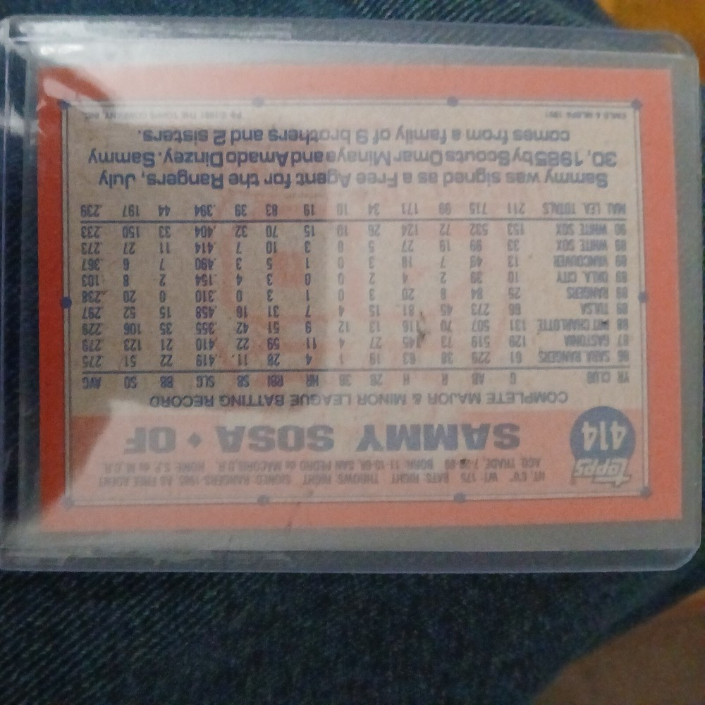Celebrate a piece of baseball history with the Sammy Sosa #414 Topps 40 Years of Baseball 1991 Error Card. This card, featuring the iconic Chicago White Sox player, is a unique collectible from the 1991 Topps set, commemorating the sport's storied past. It's presented in English and retains the classic card stock material of the era. The card, manufactured in the United States, is a testament to the MLB World Series event, capturing the essence of Sammy Sosa's athletic prowess during the 1991 season. It's a vintage original, a must-have for collectors and enthusiasts, with the distinction of being a rare error card due to the incorrect birthday imprint. This piece of sports memorabilia is a treasured nod to the rich legacy of Major League Baseball.