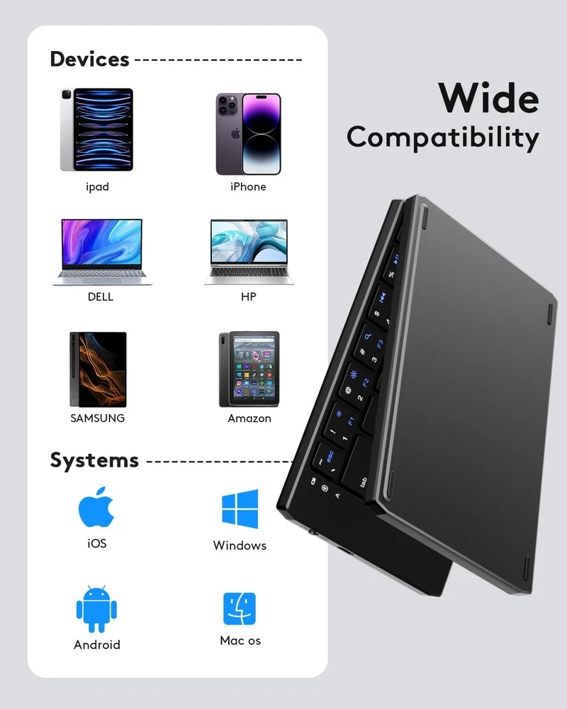 Samsers Foldable Bluetooth Keyboard Portable Folding BT x 1, Black Product Details Product Dimensions: 11.6 x 3.95 x 0.25 inches Item Weight: 10.2 ounces Manufacturer: Samsers Batteries: 1 Lithium Ion batteries required. (included) Brand: Samsers Compatible Devices: Laptop, PC, Tablet, Smartphone Connectivity Technology: Bluetooth Keyboard Description: Flexible Recommended Uses For Product: Everyday Use, Education, Business Special Feature: Portable, Lightweight, Hotkeys and Media Keys, Foldable Color: Black Number of Keys: 104 Style: Contemporary & Modern Product Dimensions: 11.6"L x 3.95"W x 0.25"H 【Foldable Portable Keyboard】Only 6.5-ounce palm-sized keyboard can be folded into your pocket or backpack to carry around. Quiet keys allow you to focus on your work. Standard-size design provides accurate, fast typing, just like the desktop keyboard you are used to. Maximum convenience for you with minimum weight and size! 【Compact Travel Keyboard】 Compact pocket size design to easily carry it with you. Magnetic lock keeps it closed while traveling. Auto-reconnect function allows automatic reconnection to the last connected device when turning on. Maintains a stable connection and provides fast response to devices within 10 meters of operating range. With Samsers folding keyboard, you can start writing down your thoughts, replying to emails, editing excel sheets quickly anywhere! 【Long Battery Life】Easily recharged via the included Type-C cable. Built-in large capacity battery can be used for 60 hours of continuous operation or 90 days of standby. One full charge last enough for your short business trip or vacation! 【Folding Bluetooth keyboard 】Comes with a foldable phone holder that transforms your tablet into a laptop in less than a second. 6 adjustable angles to meet your different viewing needs! Work or leisure when you go to different places like cafes offices or libraries~ 【Sincere Service】Samsers provides you with 24-hour email reply and lifetime technical support. If you have any questions, please feel free to contact us! ~ 【Warm tips】 After receiving the keyboard, please keyboard for 2 hours fully charged, the battery power will lead to abnormal battery function