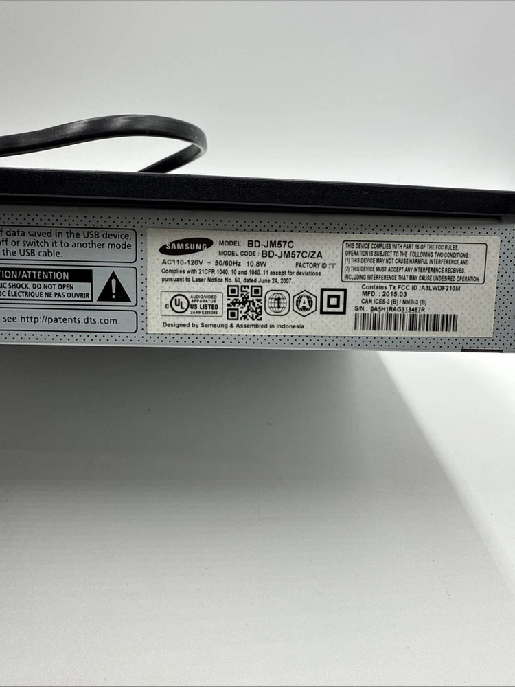 Maximum Resolution:1080p (HD)Model:BD-JM57CScreen Size:N/ACountry/Region of Manufacture:IndonesiaPlayable Media Format:Blu-ray, DVD, DVD+R, DVD+RWNumber of VCR Heads:N/Agtin13:N/AColor:BlackBrand:SamsungConnectivity:HDMIDimensions (WxHxD):11 1/2" x 1.56" x 8 3/4"UPC:N/AFeatures:Internet Apps, Smart TV Os/Interface, Full HD, Remote Control, USB Input, Built-In Wi-Fi, Wi-Fi ReadyRecordable Media Format:Blu-ray BD-R, Blu-ray BD-RE, CD-R, CD-RW, DVD+R, DVD+RW, DVD-R, DVD-RWType:Blu-ray PlayerRegion Code:Blu-ray: AMPN:BD-JM57C