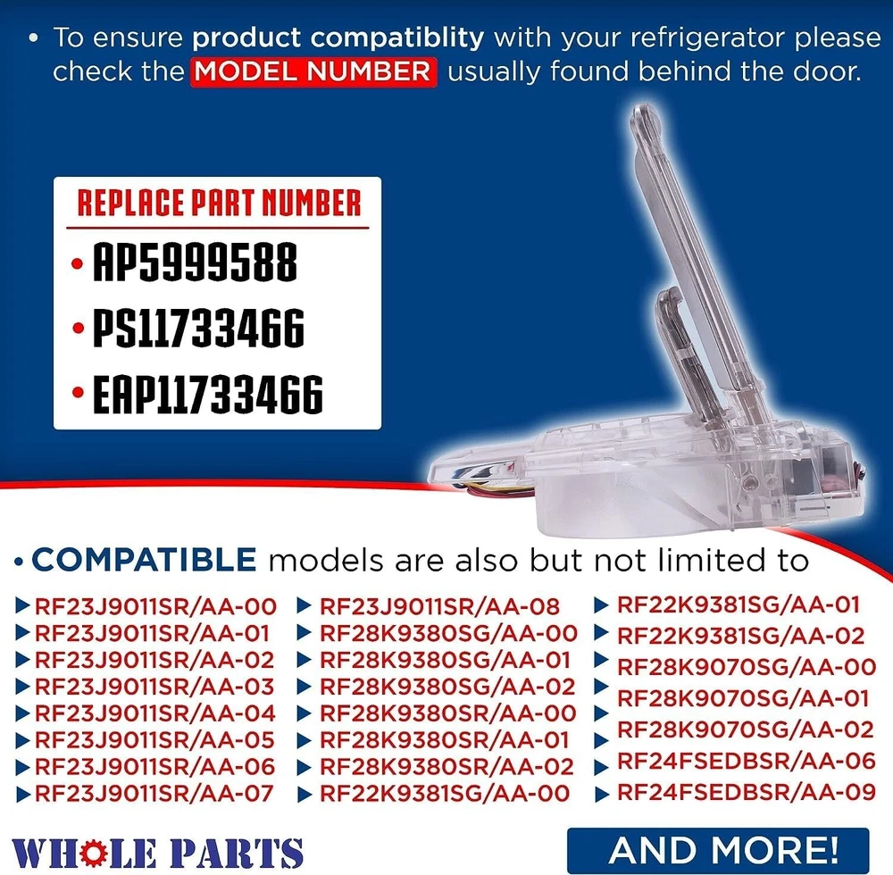 Whole Parts Upgraded Refrigerator Door Water & Ice Dispenser Lever Paddle Part# DA97-08519A - Replacement & Compatible with Some Samsung Refrigerators- 2YRS Warranty 🔧Whole Parts Refrigerator Door Water & Ice Dispenser Lever Paddle, Stainless Steel Finish Part# DA97-08519A. This Part Replaces AP4578518, 2051414, PS4175907. ✔️Compatible models are but not limited to: RF4287HAWPXAA, RF4287HARS/XAA-00, RF4287HARS/XAA-01, RF4287HARS/XAA-02, RF4287HARS/XAA-03, RF4289HARS/XAA-00, RF4289HARS/XAA-01, RF4289HARS/XAA-02, RF4289HARS/XAA-03, RF4287HAWP/XAA-00, RF4287HABP/XAA-00, RF4287HABP/XAA-01, RF4287HABP/XAA-02, RF4287HABP/XAA-03, RF4287HABP/XAA-04, RF4287HAPN/XAA-00, RF4287HAPN/XAA-01, RF4289HARS/XAA-04. ✔️Whole Parts #DA97-08519A replacement part for a refrigerator dispenser lever is designed to fit many Samsung ice makers with different models. Ensure that the Samsung refrigerator door parts you choose are compatible with your ice maker and water dispenser. 💲MANUFACTURED AND TESTED to function as well as original OEM Branded Parts but at a better value than the a comparable original equipment manufacturer part. 💪QUALITY, DURABILITY, FUNCTION at a reasonable price for both the professional repairman and DIY repairs of home kitchen appliances.