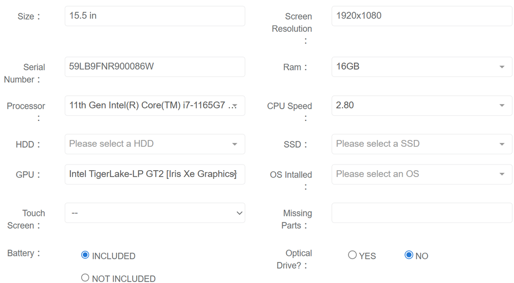 Samsung Galaxy Book Pro 15" Functionality: Functional but needs SSD Condition Rating: GRADE B Battery Health: 85+% Drive Health: No Drive Installed Minor Scratches and Wear (as seen in photos) Small Dents (as seen in photos) Specs Processor: Intel Core i7-1165G7 2.8GHz OS: No OS RAM: 16GB GPU: Iris XE Graphics Storage: No SSD Screen Size: 15.5" Included Laptop Not Included Charger Original Box On Dec 12, 2025 at 16:16:42 PST, seller added the following information: