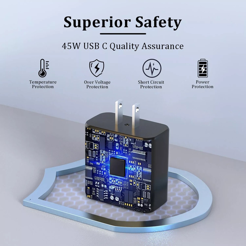 Features 【45W Fast Charging】 PD3.0 power supply technology ensures that all Samsung Galaxy devices can get the best and fast safe charging experience (45W) 【Type C PD Charger】 USB C Charger can charge most USB Type-C and PD devices and non-PD devices at full speed. 【USB-C to USB-C Charging Cable】 6 feet , convenient for charging in different occasions, suitable for travel, home, car, office, etc.6FT Type C to C Cable - USB-C connector offers a user-friendly reversible design, fast Charging and transferring, Up to 480 Mbps data transfer speed. Power output up to 3 Amp 【Fast Charging】 Built-in smart chip, PD wall charger automatically matches the current required by the device. 【Safe and Reliable】 Overcurrent, overvoltage and short circuit protection can effectively protect your equipment from damage. 【Small Size】 Small size and lightweight weight ensure maximum portability. Slim enough to carry with you. 【Wide Compatibility】 USB-C PD3.0 charger is consistent for Samsung, etc. Specifications Color:Black Material: ABS Type: 45W Super Fast Charger Type C (USB C) Input: 100-240V, 50-60Hz, 1.2A Output: (PDO): 5.0V-3.0A or 9V-3.0A or 15.0V-3.0A or 20.0V-2.25A (PPS) 3.3-11.0V--4.05A or 3.3-16.0V--2.8A or 3.3-21.0V--2.1A Consistent with For Samsung Galaxy A20/A21/A22/A50/A51/A52/A70/A71/A72/A90/A91/A92 For Samsung Galaxy S8/S8+ For Samsung Galaxy S9/S9+ For Samsung Galaxy S10/S10+/S10e For Samsung Galaxy S20 For Samsung Galaxy S20 5G For Samsung Galaxy S20+ For Samsung Galaxy S20+ 5G For Samsung Galaxy S20 Ultra 5G For Samsung Galaxy S20 FE For Samsung Galaxy S21 5G For Samsung Galaxy S21+ 5G For Samsung Galaxy S21 Ultra 5G For Samsung Galaxy S22 For Samsung Galaxy S22 Plus For Samsung Galaxy Note10, For Samsung Galaxy Note10+, For Samsung Galaxy Note10+ 5G, For Samsung Galaxy Note10 5G, For Samsung Galaxy Note8, For Samsung Galaxy Note9 All Type C Device Package Include: 1 x 45W Super Fast Wall Charger + 6FT Cable