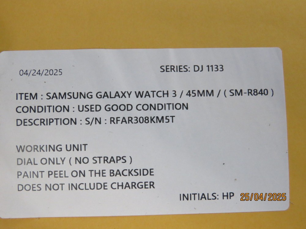 Samsung Galaxy Watch 3 45mm Black Case (NO STRAP) (SM-R840) [DJ1133] Functional Condition: Tested and Functional. Paint Peel On Back Of The Watch. Cosmetic Condition: This is a Used Item and Normal Wear (Scuffs & Scratches) is Expected. Items included in this listing: Watch Items NOT included in this listing: Strap Charger Thank you for Shopping with Us! ENJOY Free Shipping in USA & Low Cost Shipping to CANADA! Terms of Sale NOTE: Our Listings only include items as pictured - Please do not assume any item is included if its not pictured. We will try our best to picture all items included in this listing as well as its cosmetic condition. We Guarantee & Stand Behind our product and commitment to provide you with o nly Original, Branded, OEM & Genuine Products Shipping A complete and correct shipping address is essential. We cannot guarantee the shipping address can be changed after checkout. Sales Tax will be charged to all Canadian & USA Buyers. Combined shipping is not guaranteed. We are unable to change any content of your order based on the eBay checkout note or PayPal message. Customers with shipping addresses outside of the U.S.A and Canada are responsible for all duties and import taxes. Please contact your customs for information Bidding All items are accurately described and pictured. Please ensure you are consciously bidding on the items as described. Payment Payments are expected at the time of purchase or in case of Auctions, at the end of auctions. Payments are managed via eBay Managed Payments Contact Us Your positive feedbacks are extremely valuable to us. If you have any concerns about your order, please contact us through eBay message to resolve any issues before leaving a negative feedback or opening a dispute. We will reply within 24 Hours Return Policy All items are in used condition unless specified.