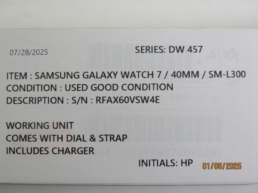 Samsung Galaxy Watch 7 40mm SM-L300 [DW457] Functional Condition: Tested and Functional. Cosmetic Condition: This is a Used Item and Normal Wear (Scuffs & Scratches) is Expected. Items included in this listing: DIAL STRAP CHARGER Items NOT included in this listing: N/A Thank you for Shopping with Us! ENJOY Free Shipping in USA & Low Cost Shipping to CANADA! Terms of Sale NOTE: Our Listings only include items as pictured - Please do not assume any item is included if its not pictured. We will try our best to picture all items included in this listing as well as its cosmetic condition. We Guarantee & Stand Behind our product and commitment to provide you with o nly Original, Branded, OEM & Genuine Products Shipping A complete and correct shipping address is essential. We cannot guarantee the shipping address can be changed after checkout. Sales Tax will be charged to all Canadian & USA Buyers. Combined shipping is not guaranteed. We are unable to change any content of your order based on the eBay checkout note or PayPal message. Customers with shipping addresses outside of the U.S.A and Canada are responsible for all duties and import taxes. Please contact your customs for information Bidding All items are accurately described and pictured. Please ensure you are consciously bidding on the items as described. Payment Payments are expected at the time of purchase or in case of Auctions, at the end of auctions. Payments are managed via eBay Managed Payments Contact Us Your positive feedbacks are extremely valuable to us. If you have any concerns about your order, please contact us through eBay message to resolve any issues before leaving a negative feedback or opening a dispute. We will reply within 24 Hours Return Policy All items are in used condition unless specified.