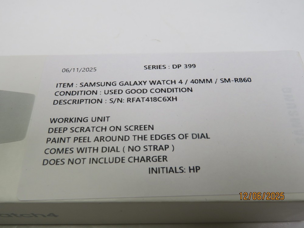 Samsung Galaxy Watch4 SM-R860 40mm Aluminum Case - Silver [DP399] Functional Condition: Tested and Functional. Deep Scratch On Screen. Paint Peel Around The Edges Of The Dial. Cosmetic Condition: This is a Used Item and Normal Wear (Scuffs & Scratches) is Expected. Items included in this listing: Watch Items NOT included in this listing: Strap Charger Thank you for Shopping with Us! ENJOY Free Shipping in USA & Low Cost Shipping to CANADA! Terms of Sale NOTE: Our Listings only include items as pictured - Please do not assume any item is included if its not pictured. We will try our best to picture all items included in this listing as well as its cosmetic condition. We Guarantee & Stand Behind our product and commitment to provide you with o nly Original, Branded, OEM & Genuine Products Shipping A complete and correct shipping address is essential. We cannot guarantee the shipping address can be changed after checkout. Sales Tax will be charged to all Canadian & USA Buyers. Combined shipping is not guaranteed. We are unable to change any content of your order based on the eBay checkout note or PayPal message. Customers with shipping addresses outside of the U.S.A and Canada are responsible for all duties and import taxes. Please contact your customs for information Bidding All items are accurately described and pictured. Please ensure you are consciously bidding on the items as described. Payment Payments are expected at the time of purchase or in case of Auctions, at the end of auctions. Payments are managed via eBay Managed Payments Contact Us Your positive feedbacks are extremely valuable to us. If you have any concerns about your order, please contact us through eBay message to resolve any issues before leaving a negative feedback or opening a dispute. We will reply within 24 Hours Return Policy All items are in used condition unless specified.