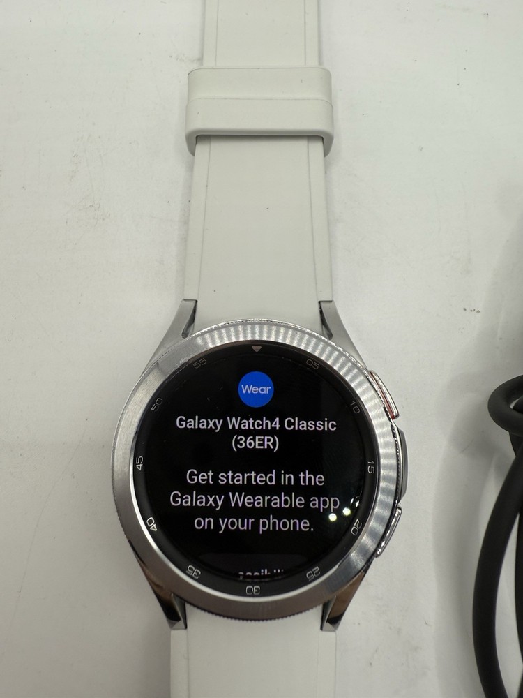 Used In great condition comes with watch band and charger The Samsung Galaxy Watch4 Classic 42mm Stainless Steel SM-R880 in Silver is a high-quality smartwatch designed by Samsung. It features a sleek silver stainless steel case with a comfortable white ridges-sport band made of durable fluoroelastomer material. The watch is water-resistant, has an AMOLED display, and is Wi-Fi capable, making it a versatile and stylish accessory for Android users. With Bluetooth connectivity, this smartwatch offers a range of features to enhance your daily life.