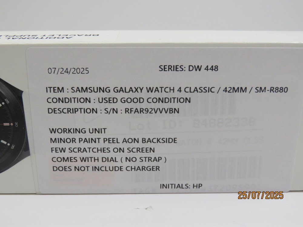 Samsung Galaxy Watch4 Classic SM-R880 42mm [DW448] Functional Condition: Tested and Functional. Cosmetic Condition: This is a Used Item and Normal Wear (Scuffs & Scratches) is Expected. MINOR PAINT PEEL ON BACKSIDE Items included in this listing: DIAL Items NOT included in this listing: STRAP CHARGER Thank you for Shopping with Us! ENJOY Free Shipping in USA & Low Cost Shipping to CANADA! Terms of Sale NOTE: Our Listings only include items as pictured - Please do not assume any item is included if its not pictured. We will try our best to picture all items included in this listing as well as its cosmetic condition. We Guarantee & Stand Behind our product and commitment to provide you with o nly Original, Branded, OEM & Genuine Products Shipping A complete and correct shipping address is essential. We cannot guarantee the shipping address can be changed after checkout. Sales Tax will be charged to all Canadian & USA Buyers. Combined shipping is not guaranteed. We are unable to change any content of your order based on the eBay checkout note or PayPal message. Customers with shipping addresses outside of the U.S.A and Canada are responsible for all duties and import taxes. Please contact your customs for information Bidding All items are accurately described and pictured. Please ensure you are consciously bidding on the items as described. Payment Payments are expected at the time of purchase or in case of Auctions, at the end of auctions. Payments are managed via eBay Managed Payments Contact Us Your positive feedbacks are extremely valuable to us. If you have any concerns about your order, please contact us through eBay message to resolve any issues before leaving a negative feedback or opening a dispute. We will reply within 24 Hours Return Policy All items are in used condition unless specified.