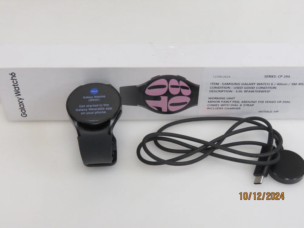 Samsung Galaxy Watch6 40mm Graphite Bluetooth Smartwatch SM-R930NZKAXAA Functional Condition: Tested and Functional. Minor Paint Peel Around The Edges Of The Dial. Cosmetic Condition: This is a Used Item and Normal Wear (Scuffs & Scratches) is Expected. Items included in this listing: Watch Strap Charger Items NOT included in this listing: N/A Thank you for Shopping with Us! ENJOY Free Shipping in USA & Low Cost Shipping to CANADA! Terms of Sale NOTE: Our Listings only include items as pictured - Please do not assume any item is included if its not pictured. We will try our best to picture all items included in this listing as well as its cosmetic condition. We Guarantee & Stand Behind our product and commitment to provide you with o nly Original, Branded, OEM & Genuine Products Shipping A complete and correct shipping address is essential. We cannot guarantee the shipping address can be changed after checkout. Sales Tax will be charged to all Canadian & USA Buyers. Combined shipping is not guaranteed. We are unable to change any content of your order based on the eBay checkout note or PayPal message. Customers with shipping addresses outside of the U.S.A and Canada are responsible for all duties and import taxes. Please contact your customs for information Bidding All items are accurately described and pictured. Please ensure you are consciously bidding on the items as described. Payment Payments are expected at the time of purchase or in case of Auctions, at the end of auctions. Payments are managed via eBay Managed Payments Contact Us Your positive feedbacks are extremely valuable to us. If you have any concerns about your order, please contact us through eBay message to resolve any issues before leaving a negative feedback or opening a dispute. We will reply within 24 Hours Return Policy All items are in used condition unless specified.