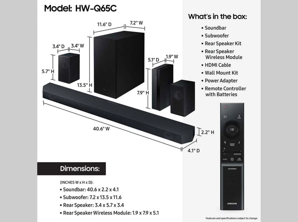 SAMSUNG Q-series 5.1 Channel Sound Bar with Wireless Subwoofer, Q-Symphony & Dolby ATMOS Audio | Model # HW-Q65C/ZA Experience Unmatched Audio Quality Get ready to immerse yourself in the ultimate audio experience with the Q65C sound bar. This audio all-star uses Q-Symphony technology to harmonize with your Samsung TV speakers, delivering an extraordinary sound performance that will elevate your entertainment experience. Be it movies, music, or gaming, the sound bar's superior audio quality will ensure you don't miss a beat. 5.1ch Dolby Atmos Sound The Q65C sound bar is equipped with 5.1ch Dolby Atmos sound, a technology that provides a three-dimensional audio experience. With this feature, you can enjoy a cinematic sound that is rich, detailed, and engrossing. Every sound element is heard as intended, providing a listening experience that is as close to reality as it gets. Adaptive Sound Lite With Adaptive Sound Lite, the Q65C sound bar enhances the clarity and detail of dialogue and vocals in your favorite content. This feature intelligently adjusts sound settings according to what you're watching, ensuring optimal audio performance at all times. Whether you're watching an action-packed movie or a dialogue-heavy drama, you'll hear every word with crystal clear precision.