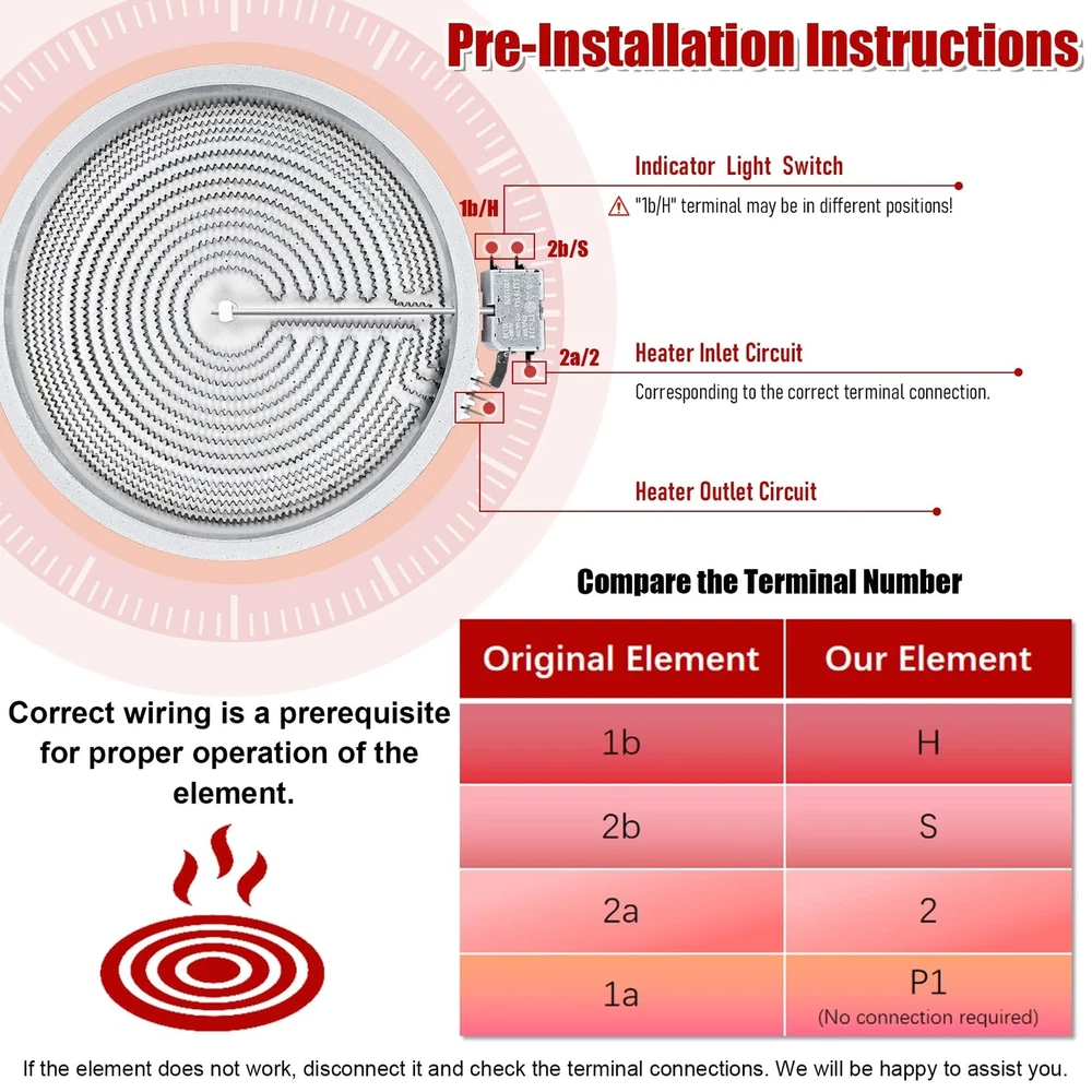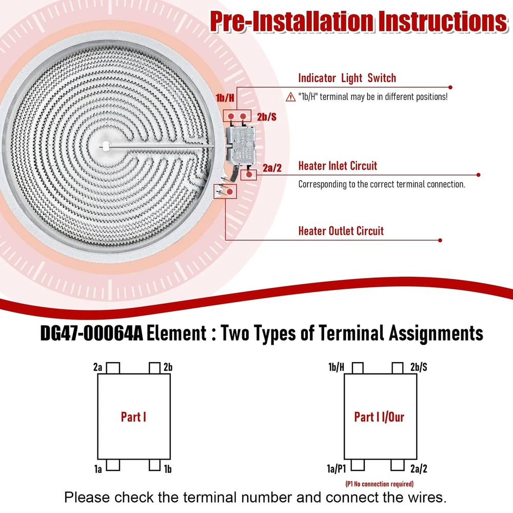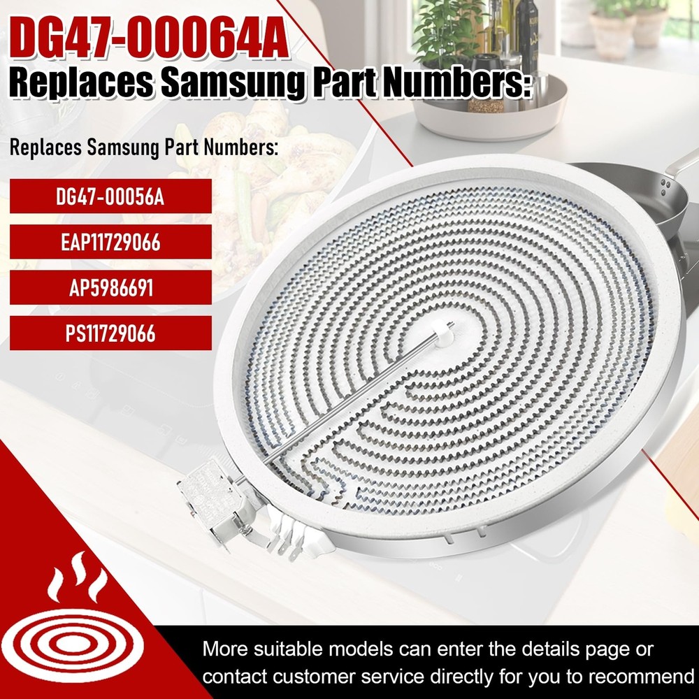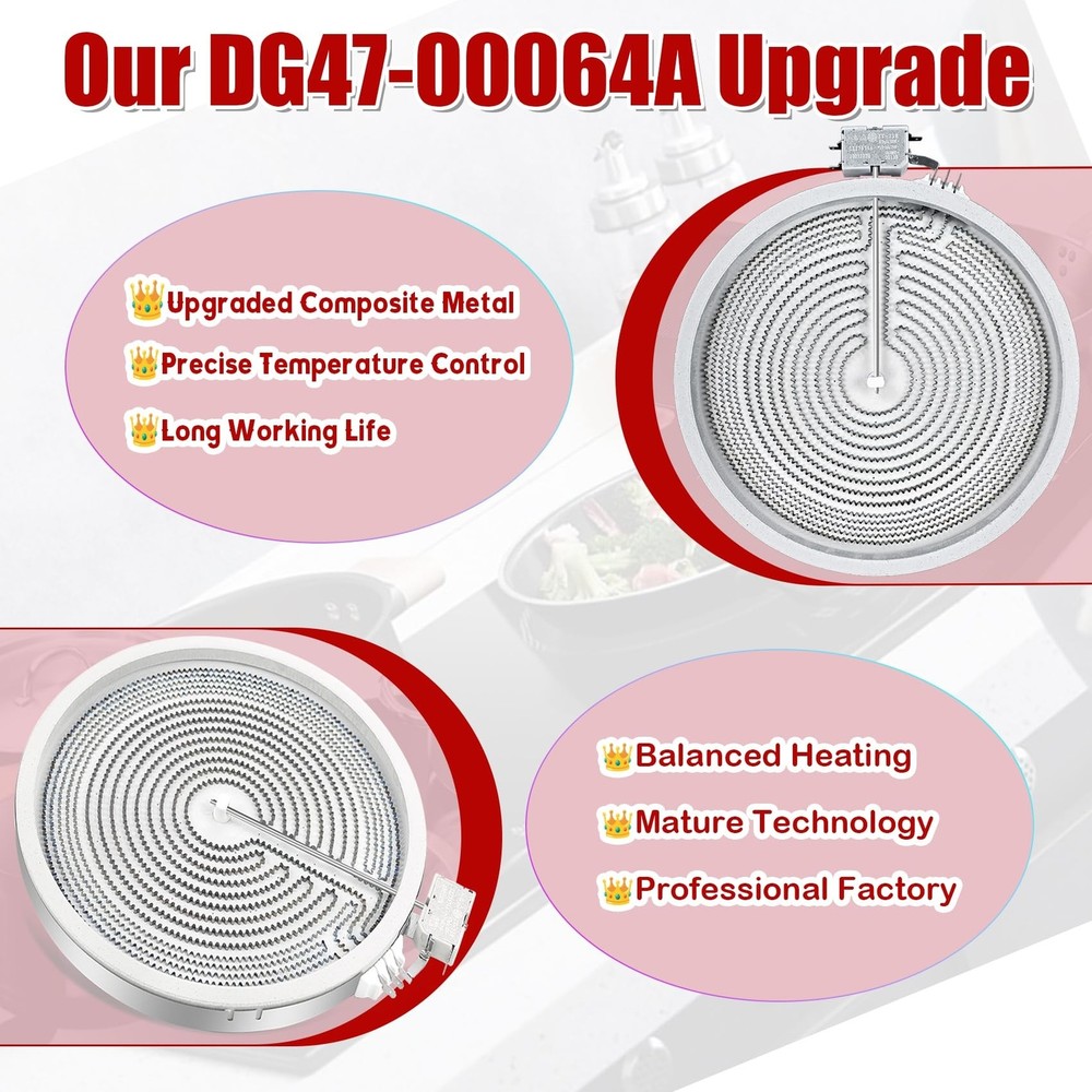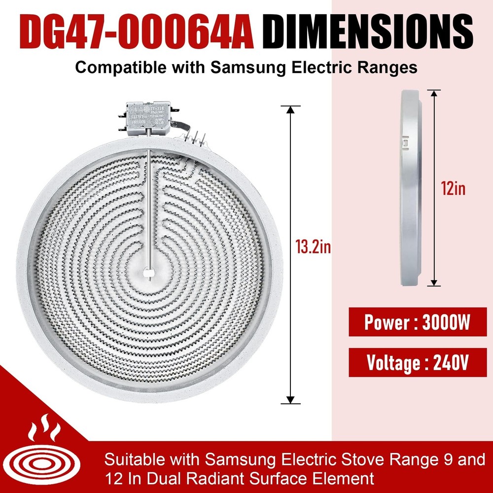 UPGRADE DG47-00064A DG47-00056A Compatible With Samsung Stove Range Electric Range 9/12 Inch Dual Radiant Heater Element Replacement EAP11729066 AP5986691 PS11729066 Surface Element Product Details Style: DG47-00064A Brand: OEM home MPN: DG47-00064A UPC: Does not apply EAN: Does not apply Manufacturer: OEM home Part Number: DG47-00064A Item Weight: 2.68 pounds Product Dimensions: 12 x 12 x 1.3 inches Country of Origin: China Item model number: DG47-00064A , DG47-00056A Style: DG47-00064A Included Components: Radiant Heater Element Batteries Included?: No Batteries Required?: No Warranty Description: 1 year Date First Available: October 7, 2023 [Excellent Quality] DG47-00064A Haliant/Radiant surface component temperature sensor has been upgraded to a new composite metal material,with a longer service life. [High Adaptability] Upgrade DG47-00064A radiant surface element,use for Samsung Stove,replacing: DG47-00056A EAP11729066 AP5986691 PS11729066.Circuit connector improved , easy to connect operation. [Stronger Heating] Upgrade DG47-00064A haliant surface element dual radiation range, and the heating increased , resulting in higher efficiency and faster heating. [Note] Before installing, take a photo of the original element's interface wiring pattern. Install the wires to the new component terminals according to the connector markings in the photo. If the component doesn't work post-installation, double-check the interface connection.