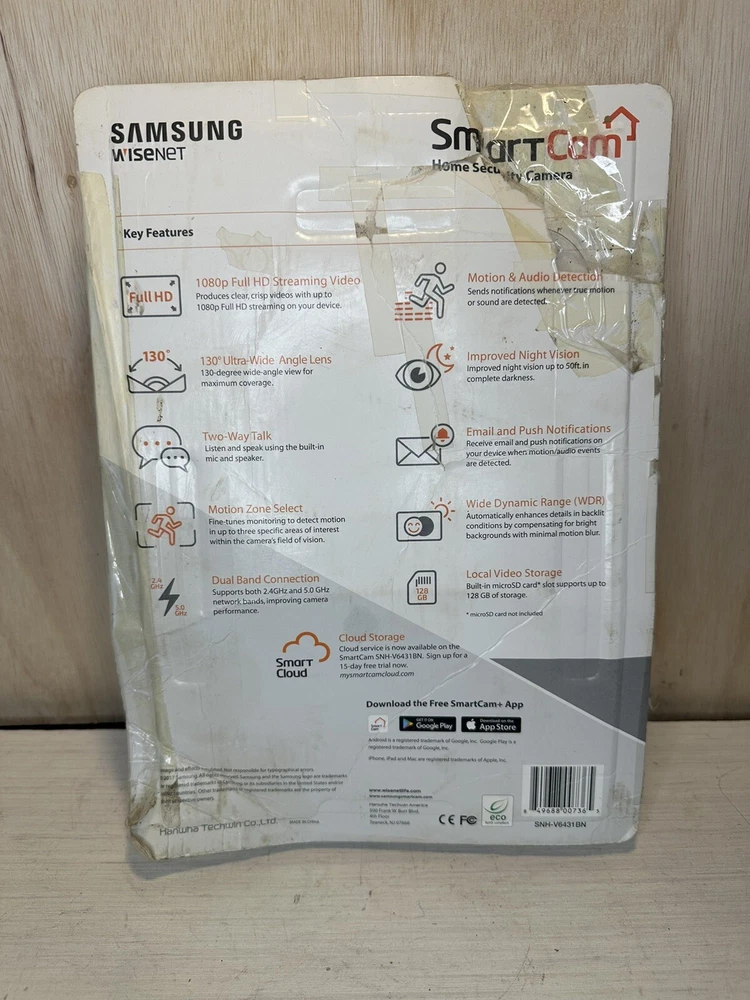 Operating Range: 6 m Brand: Samsung Item Weight: 1 lbs. Smart Home Compatibility: Google Assistant, Amazon Alexa, Samsung SmartThings Compatible Brand: Android/iOS, Samsung Surveillance Technology: IP/Network Number of Cameras Included: 1 Maximum Resolution: 1080p Power: 35 W Number of Channels: 1 Storage Capacity: microSD, 128 GB, Up to 128 GB with a microSD Card UPC: 0849688007365 Type: Dome Operating Sound Rating: 100 dB Item Height: 3 in Connectivity: Wireless, Infrared, Wired, Wi-Fi Year Manufactured: 2017 Power Source: USB, Wall Plug-In MPN: SNHV6431BN Features: Bracket, Wi-Fi, Night Vision, Track Sensor Activity, Digital, Plug in, Motion/PIR Activated, Voice Prompts, Mini Surveillance Camera, Automatic Motion Tracking, Wall Mounted, Battery, Zoom, Pan-Tilt Zoom gtin13: 0849688007365 Model: SmartCam Color: White Color Mode: Color Day, B&W Night Smart Home Protocol: Infrared, Wi-Fi