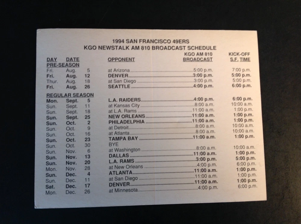 San Francisco 49ers 1994 Pocket Schedule KGO News Talk 810 VTG NFL Memorabilia