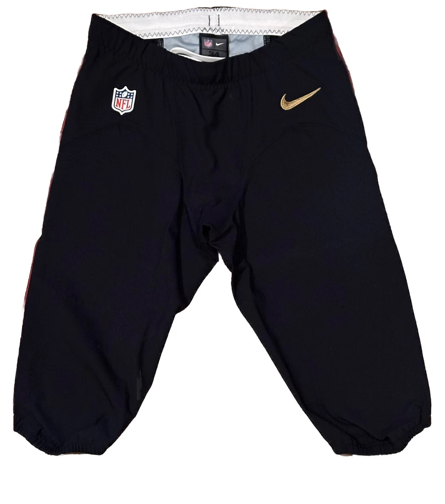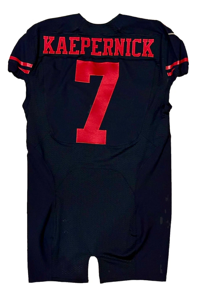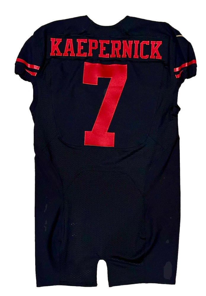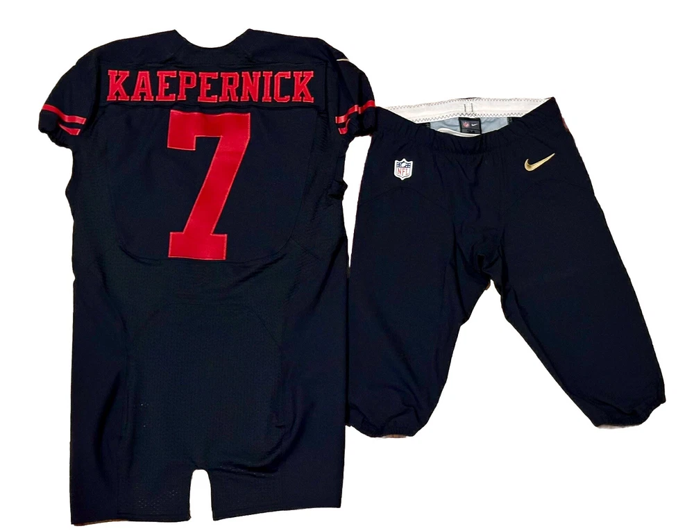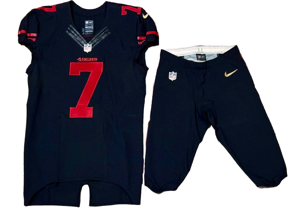 This San Francisco 49ers black game jersey is a must-have for any Colin Kaepernick fan. The jersey, made in 2015, is an original and features the player's name and number on the back. It is a single, size 44 jersey and size 34 pants that were used in a game. The jersey is perfect for any football enthusiast or collector of sports memorabilia. It is an authentic piece of game-worn clothing that represents the National Football League (NFL) and the San Francisco 49ers. This item is a unique addition to any collection and is sure to impress any fan of Colin Kaepernick or the NFL.