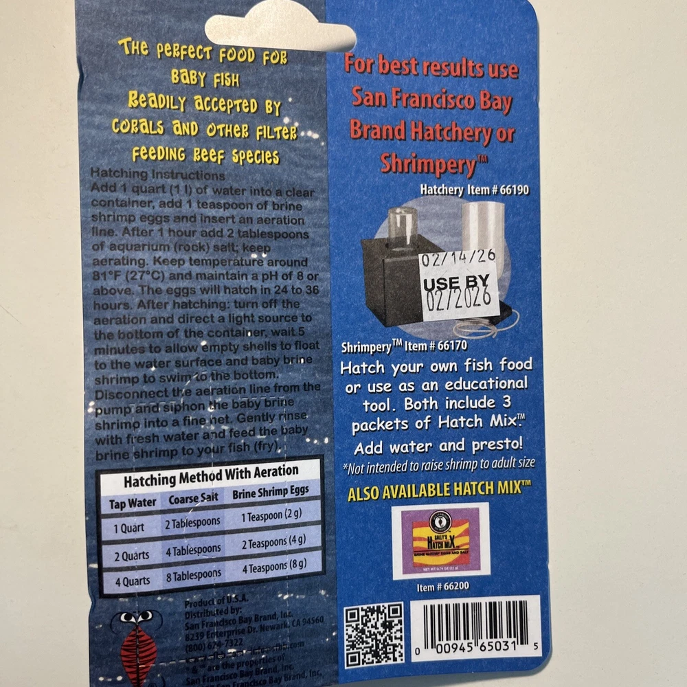 San Francisco Bay Brands Shrimp Eggs Brine (6 gm) Our brine shrimp eggs come from our FDA certified solar salt ponds in the San Francisco Bay Area. These ponds are known for being rich in algae and diatoms. Availability subject to harvest variations. 100% Brine Shrimp Eggs High level of essential amino acids and pigments Hatch baby brine shrimp for baby fish and reef tanks