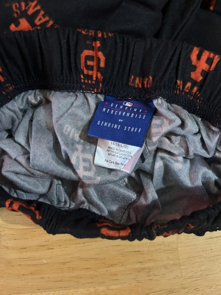 Get your little San Francisco Giants fan ready for game day with these genuine merchandise pajama pants. Made of 100% polyester, these pants are comfortable and durable, perfect for wearing to the ballpark or just around town. The pants come in a youth size 14/16 and feature the team's colors, making them a great addition to any young fan's wardrobe. These pants are officially licensed by Major League Baseball and are perfect for showing your support for the San Francisco Giants during the regular season. They are unisex and suitable for both boys and girls. These pants are made in Cambodia and are a must-have for any young fan of the team.