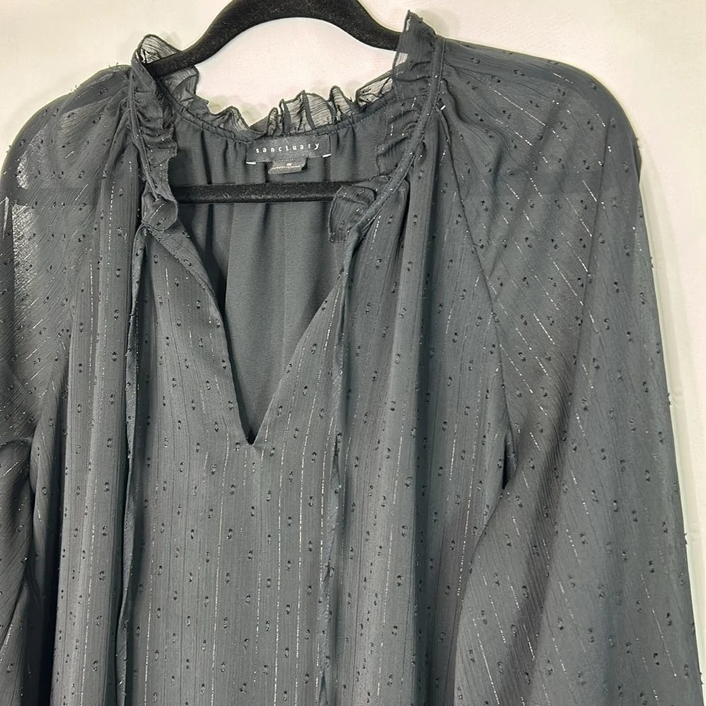 Sanctuary Tinsel Weave Chiffon Peasant Blouse Size 1X. This top is in good used condition with no notable pilling, pulls, awkward stretching or color fading. It features a textured tinsel weave chiffon shell, ties at the neck, a flowing peasant sleeve cut and ruffle at the neckline. It measures approx: bust 51in, length from shoulder to hem 25.5in.