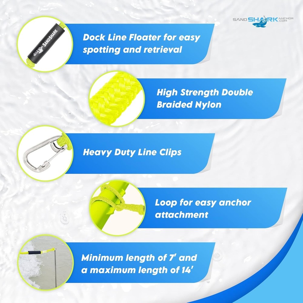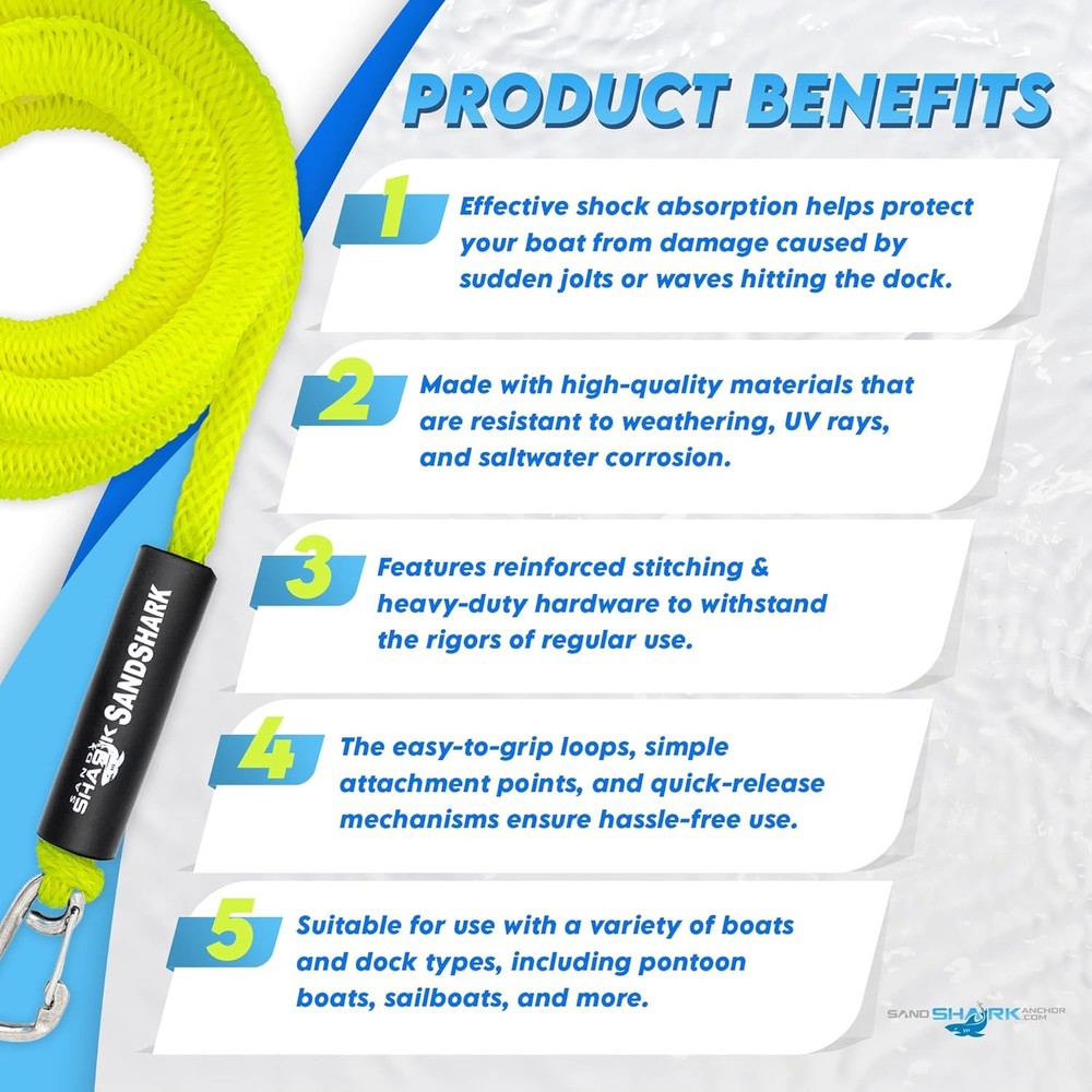 SandShark Premium Anchor Bungee Dock Line. Boat 7-14ft, Neon Green Description Features: Shock Absorbing: The bungee boat dock line the shock to your dock or anchors. These bungee dock lines for boats will give you peace of mind that your watercraft will stay put while anchored or docked! Your Sand Shark Anchor will be most effective by reducing the "SHOCK" on your dock lines or anchor from the waves. These marine boat dock bungee tie turn that "Hard-Snap" into a "Gentle-Pull". Boat Dock Lines & Rope : The boat dock lines bungee is hidden inside the ropes to act as a built-in dockline snubber. Dock bungee lines for boats, the "MUST HAVE" boating accessories and boat stuff! Anchor Line : Great buddy to your Sand Shark Anchor. Stop waves from pulling your anchor out! Now you can relax at the beach when the "big waves" are coming in! Get Yours Today! One of the best boat accessories, seadoo accessories, kayak accessories, bungee boat lines, pontoon boat accessories, mooring rope, or jet ski accessories! Must have boat line and boat ropes! Product Details: Size: 7-14ft Material: Polypropylene Color: Neon Green Brand: SandShark Vehicle Service Type: Watercraft Fastener Material: Stainless Steel Fastener Type: Snap Tensile Strength: 4000 Pounds Number of Pieces: 1 Product Dimensions: 84"L x 10"W Manufacturer: SandShark, Inc. Unit Count: 1.0 Count Model: BUN-DOC-714-GREEN Item Weight: 12 ounces Country of Origin: China Item model number: BUN-DOC-714-GREEN Manufacturer Part Number: BUN-DOC-714-GREEN Size: 7-14ft Material: Polypropylene Color: Neon Green Brand: SandShark Vehicle Service Type: Watercraft Handling We will ship all orders within 1 business day of payment. Delivery We Do Not Ship Outside of the Continental US. Return Policy All items qualify for returns within 30 days of receipt. Buyer is responsible for return shipping on any item that is not damaged. Feedback We take our reputation seriously, we buy and sell online, so we understand the value of trust. If you are unsatisfied with your order, please contact us and we will work with you to resolve it to your satisfaction.