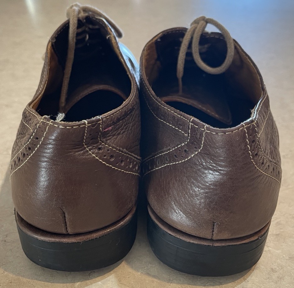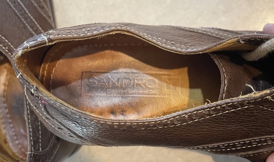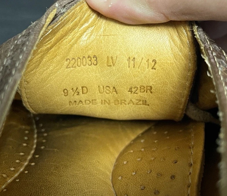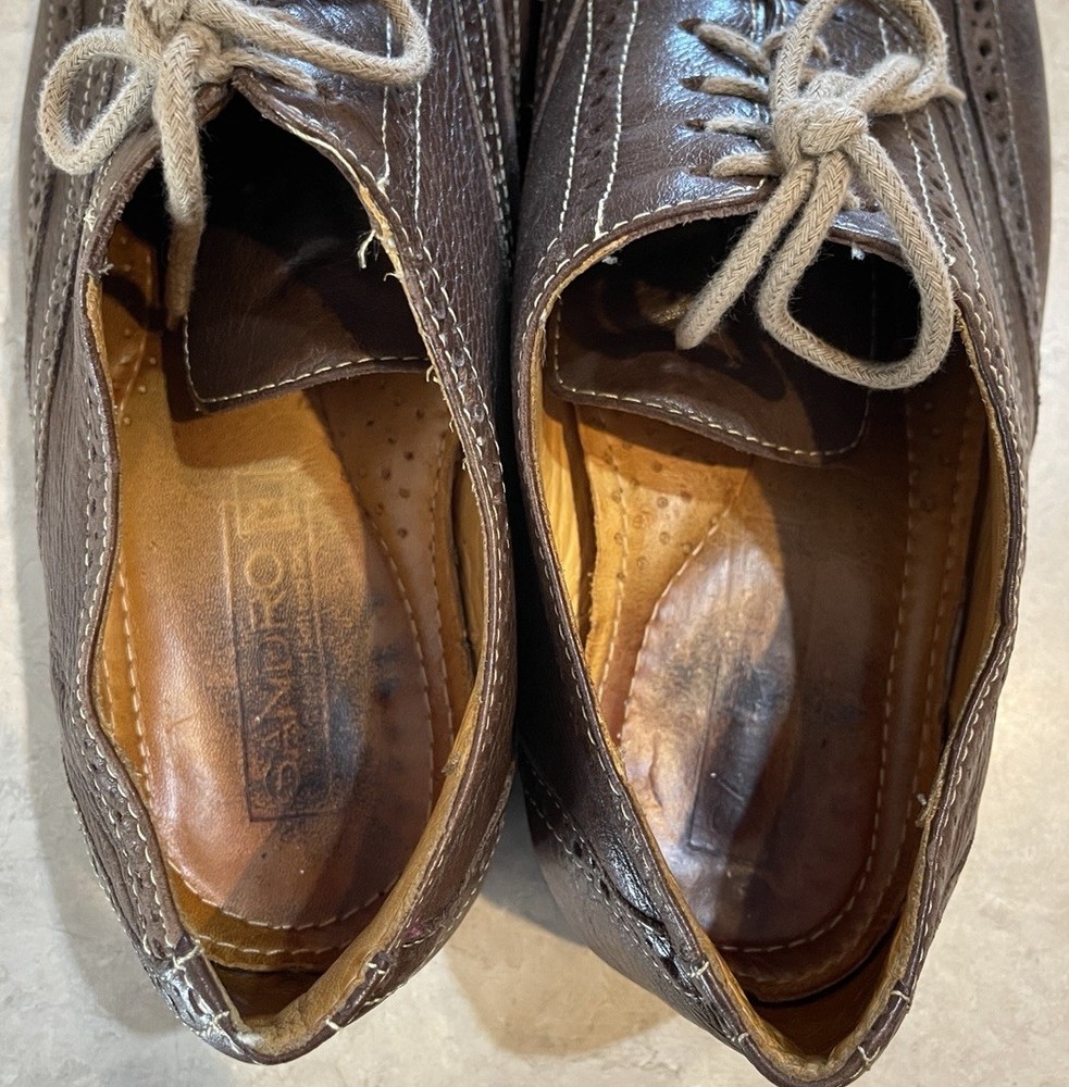 These Sandro Brown Leather Wingtip Shoes are a stylish choice for men looking for high-quality, Brazilian-made footwear. The classic wingtip design, round toe shape, and lace-up closure give these shoes a sophisticated and refined look. Crafted with leather upper material and a comfortable gel insole, these shoes are perfect for formal events or a sharp dress-up occasion. The brown color and solid pattern add to the timeless appeal of these Oxford-style shoes, making them a versatile and elegant addition to any man's wardrobe. These shoes are in good preowned condition with light signs of wear. Please see ALL photos for a better idea on condition, and any details to the shoes.