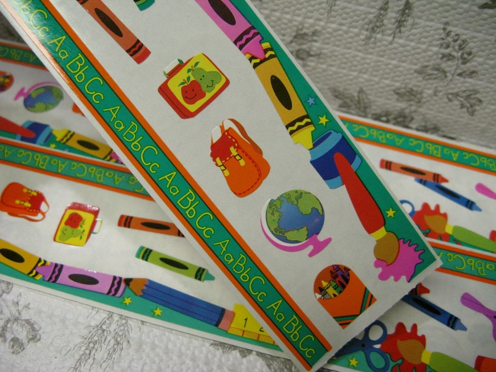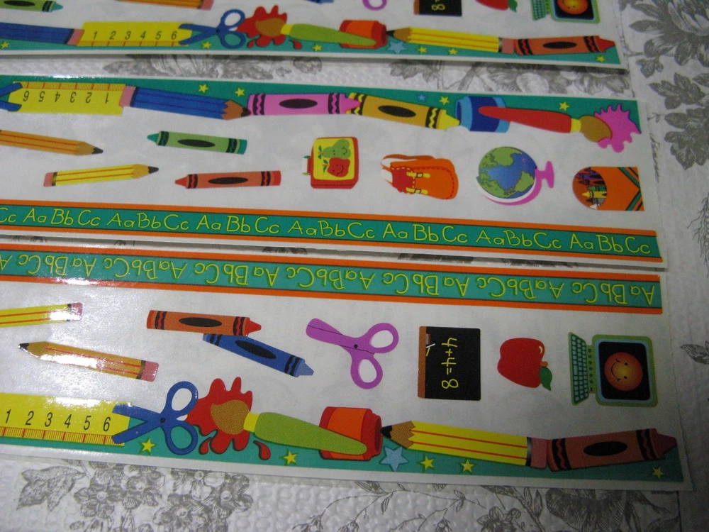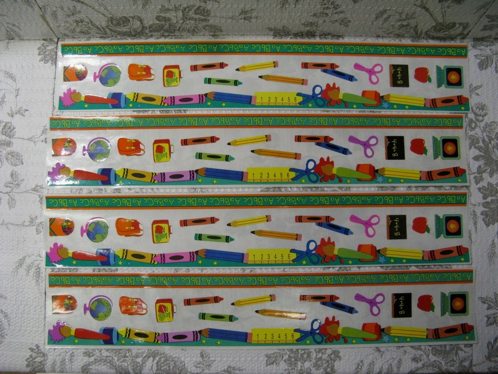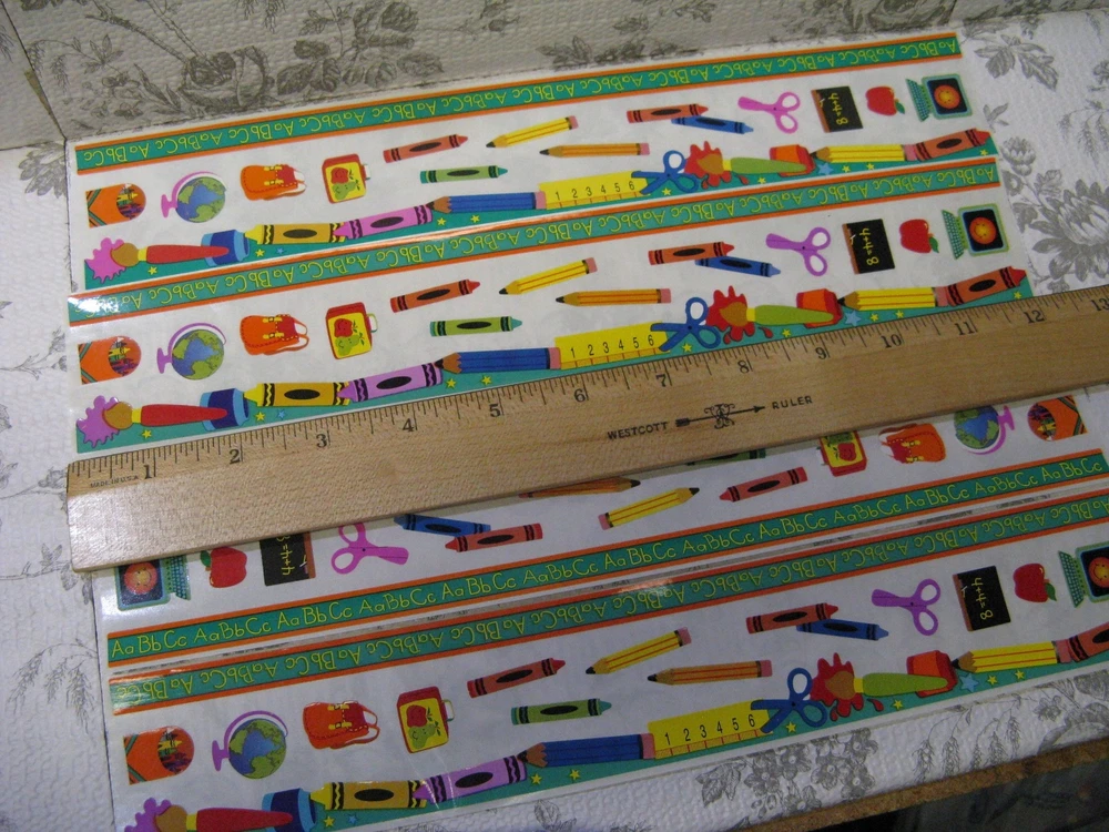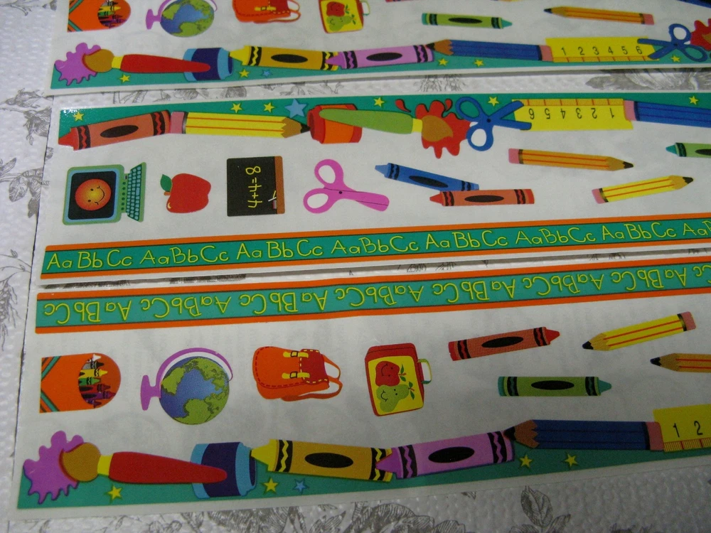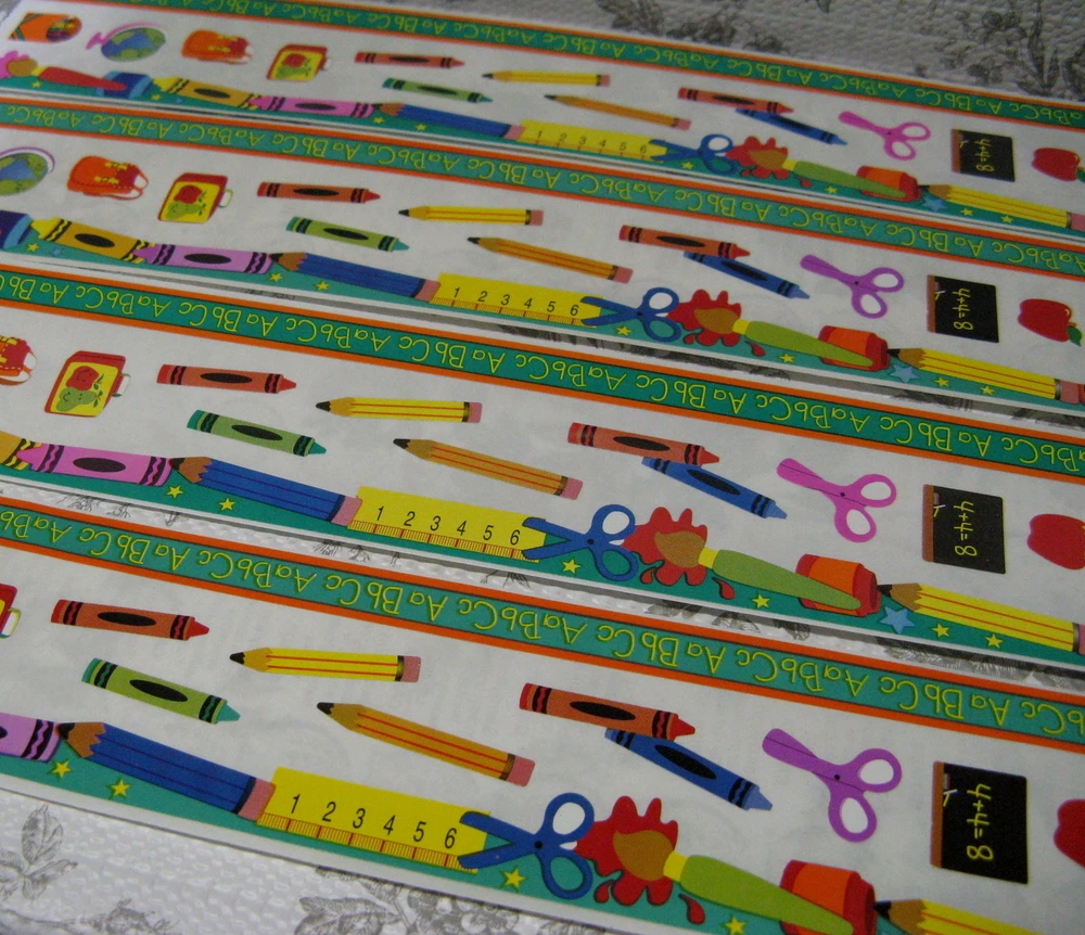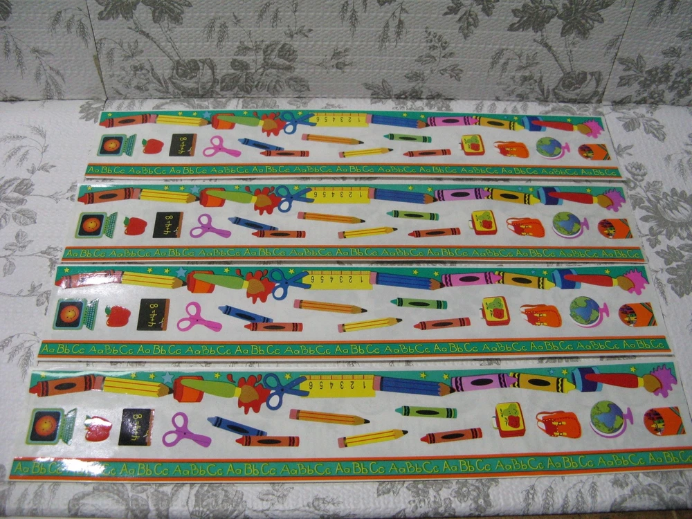 Sandylion Back To School Fun Border Sticker 4 Complete Sheets Scrapbooking Cards Four sheets, 2" X 12" One sheet has several light folds 3" from one end which I tried to show in the last photo. Please see my shop for an eclectic assortment of items.